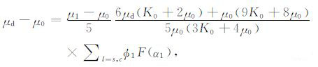 其中,K0 为固体矿物的体积模量,Kf 为孔隙饱含流体的体积模量,Kdry 和μdry 分别为干岩石骨架体积模量和剪切模量,φ 为孔隙度,Ksat 和μsat 为饱含流体岩石体积模量和剪切模量.地震波在均匀、各向同性、弹性介质中的传播速度表示如下[20]: