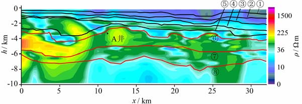 4.1 建立反演初始模型汇总所有能够收集到的地质、地球物理方法所取得的钻井、实测数据等资料,建立图 4 所示的模型.该模型中,反演的目的层界面有三个(⑥-⑧),但各层深度只是结合钻井、偏移成像资料后估计的界面大致深度,实际的界面深度值将由MT-重力模拟退火联合反演计算得出.