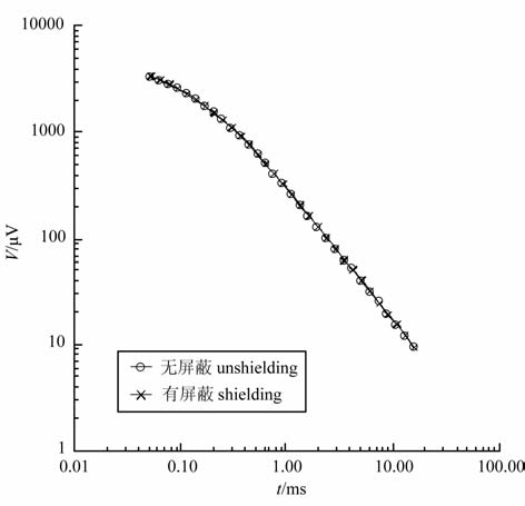 对屏蔽筒的屏蔽效果和它对测量结果的影响进行了野外实际测试.测试方法是:在野外电磁干扰比较小的地方,分别使用屏蔽和不屏蔽的高温超导磁强计作瞬变电磁法的接收传感器,使用无线对讲机做干扰源.测试采用瞬变电磁法中心回线装置,发射线框100×100m, 发射电流10A.在实验过程中,无论高温超导磁强计屏蔽与否都能正常工作,图 3 是高温超导磁强计使用屏蔽和不是有屏蔽时的瞬变电磁响应曲线,可以看出屏蔽筒不影响测量信号.表 1是测量数据误差统计表.但是,如果近距离使用对讲机,如果不采取屏蔽措施,高温超导磁强计出现失锁现象,工作不稳定;而使用屏蔽以后高温超导磁强计系统非常稳定,不受对讲机发出的高频信号的影响.实验结果说明高频屏蔽提高了HTcSQUID 强计的工作稳定性,同时又不影响测量结果.