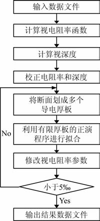 瞬变电磁感应磁场拟二维电性成像方法是:首先依据感应磁场全域电阻率公式计算视电阻率,再根据“烟圈"理论的涡流扩散速度计算视深度,然后利用剥皮法,对所得视电阻率和视深度值进行修正,最后将横向同深度层的介质分成若干块有限长度的厚板状导电介质进行正演拟合,反复进行深度、电阻率校正,得到最终的深度-电阻率地电断面,确定地下电性结构分布.程序流程图见图 4.