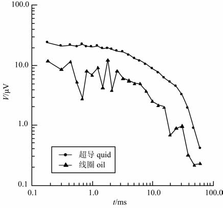 图 5 高温超导磁强计和感应线圈测量的曲线 Fig. 5 LOTEM data obtained with HTS RF SQUID magnetometer and the data obtained with induction coil |