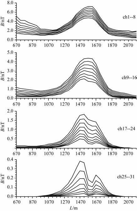 图 6 2线TEM中心回线感应磁场剖面曲线 Fig. 6 B-field response profile curves of the line 2 with HTc SQUID magnetometer for the TEM in- loop configuration |