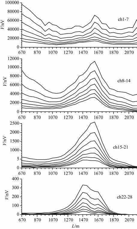 图 7 2线TEM中心回线感应电动势剖面曲线 Fig. 7 Inductive voltage response profile curve of the line 2 with coil for the TEM in-loop configuration |