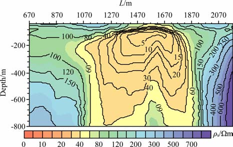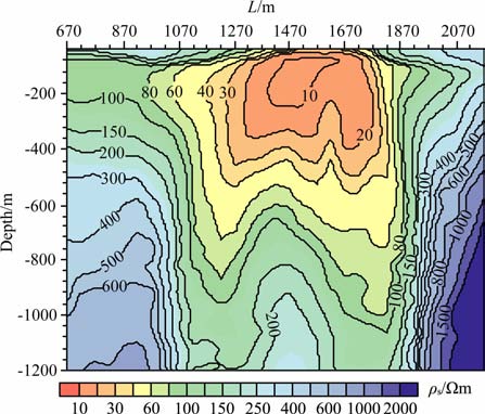 图 9 由感应电动势测量数据计算的视电阻率断面图 Fig. 9 Resistivity image section derived from the inductive voltage response profile data |