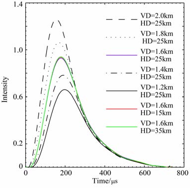 3.3 云中闪电光源位置闪电在云中发生的深度也对云顶闪电信号产生影响.在模拟过程中,将闪电光源的位置设定在相同云中不同位置.如图 3所示,闪电在云中的深度对脉冲的峰值能量影响较大,深度越深,闪电脉冲的峰值越小,水平位置的改变基本不造成影响.闪电发生的位置对输出脉冲的持续时间和达到脉冲峰值的时间影响都不大.
