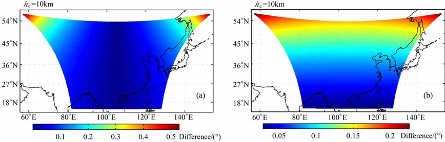 以中国上空静止卫星闪电探测为例,将所有闪电定位的云高修正值投影到卫星探测的地面区域,分别得到经向和纬向上闪电定位的云高订正偏差(如图 7(a, b)).从图 7 可看出,云顶高度影响的经向偏差以东经105°为对称轴,向东北和西北方向逐渐扩大;而其纬向偏差则随着纬度的增加而增加.