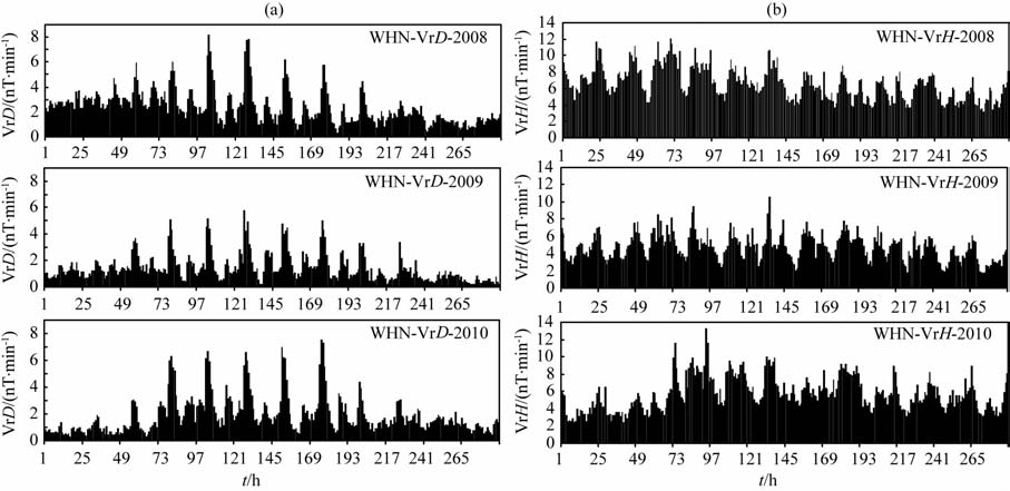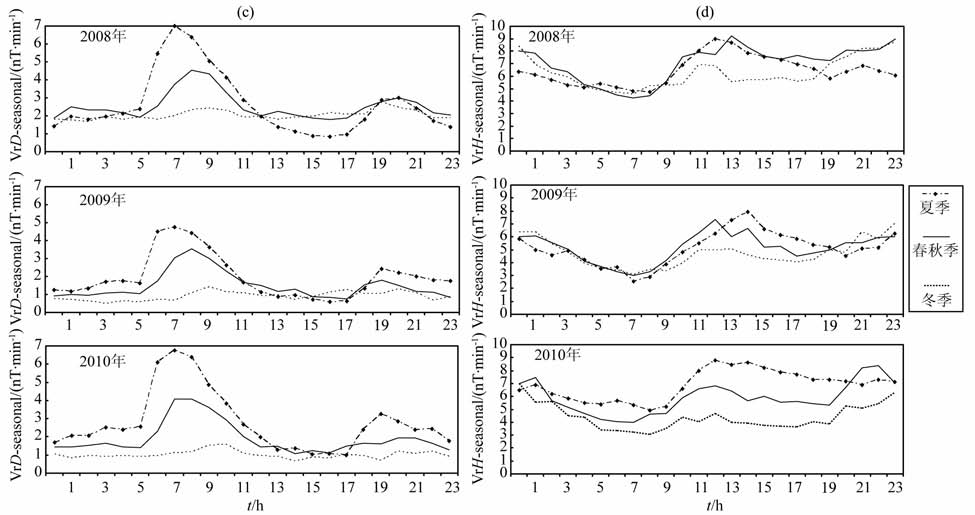 以2008-2010年武汉台的VrD为例,图 3a是武汉台的2008-2010年的1小时尺度的VrD的每个时段的月总和.按照地磁研究的惯例将全年分成三个季节,即:冬季(11、12、1、2月),夏季(5-8月)和春秋季(3、4、9、10 月),从图 3a中可以看出VrD的总体变化趋势是变幅随夏、春秋、冬三季依次减小,但是每个月的变化形态基本是一致的:呈现出两峰两谷,峰值出现在早晨6∶00-9∶00 之间和下午18∶00-20∶00之间,谷值出现在下午14∶00-16∶00之间和午夜23∶00-1∶00之间.然而VrH(图 3b)却没有出现类似于VrD的明显的季节变化,其变化每年各异,整体看来,2008年表现出上半年大下半年小的特点,2009 年整体变化比较平缓,2010 年1-3月的VrH幅值较其他月份偏低.仔细考察可以看出,如果不考虑VrD在夏季和春秋季的大幅度变化部分,则其总体变化趋势与VrH相似.不同的是,VrH也存在着与地方时有关的起伏变化,但此种变化的形态和发生时间与VrD截然不同.