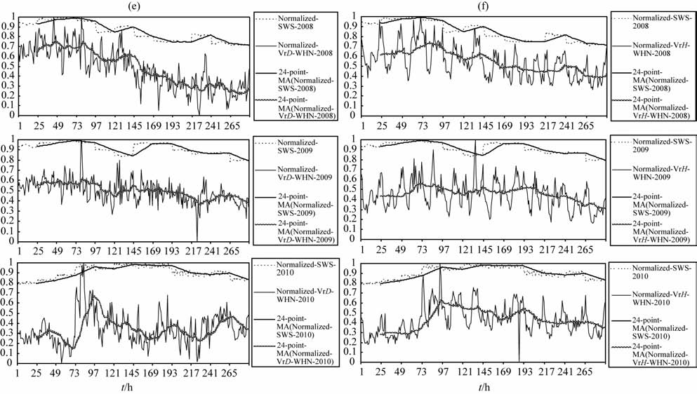为了解释VrH变化及去除季节变化后的VrD变化的原因,我们研究了它们与太阳风速度(SWS,下载自http://www.srl.caltech.edu/ACE/ASC/level2/policy_lvl2.html)变化的关系.我们用同样的方法计算了去除季节变化后的VrD、VrH和太阳风速度的每个时段的月均值.为了突出每个时段的VrD、VrH和太阳风速度的变化特征及进行数据分析的方便,我们对上述数据进行了峰值归一化处理和24小时的移动平均拟合,如图 3e和3f所示.从图 3e和3f中可以看出,去除季节变化后的VrD、VrH与太阳风速度变化基本趋于一致,计算得到的两者与太阳风速度的三年的相关系数分别为0.96、0.77、0.5(2010年相关系数低主要受3 月份Vr指数不明原因异常变化影响)和0.97、0.70、0.88.因此可以认为VrD在受季节影响的同时还受太阳风速度的控制,而VrH只受太阳风速度的影响.