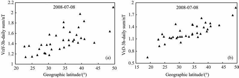 5 Vr指数的空间分布特征 5.1 Vr指数随纬度变化特征本文利用2008年我国大陆41个台站的3小时尺度的VrH和VrD指数,研究了它们随纬度的变化情况,结果表明在我国大陆范围内,Vr指数随纬度的增高而增大.图 4a和图 4b以2008年7月8日这一天为例显示了3小时尺度的VrH和VrD指数的日总和随纬度的分布情况,当天磁场非常平静,Kp最大值为1,Dst最小值为-2,AE最大值为69.从图中可以看出,在我国大陆地区,随着纬度的升高,VrH和VrD的幅度逐渐增大.