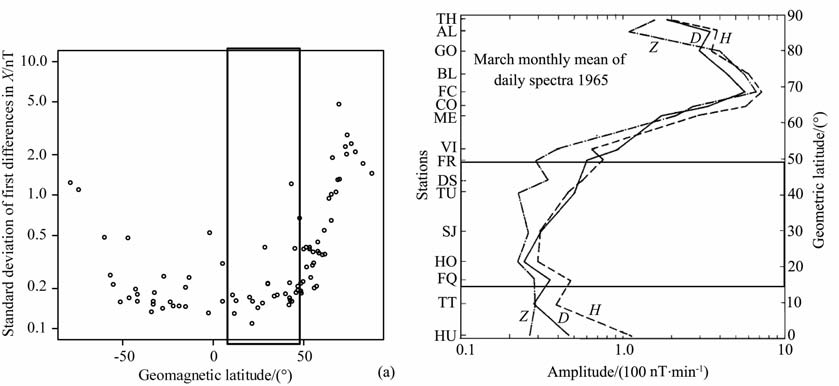 图 5 (a)2004年9月11日X分量的一阶差分的标准差随纬度分布;(b)1965年3月D、H、Z分量谱幅度随纬度分布特征[13] Fig. 5 (a) The latitudinal distribution of standard deviation of tirst ditference in X component on 11th Sep.2004 ; (b) Latitudinal display of the three orthogonal field components D,H and Z for Mar.1965[13] |