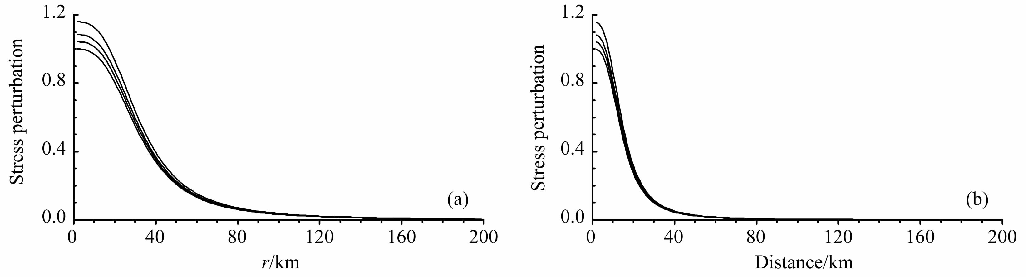 (a)M0 = 7.0,曲线从上到下依次对应、t=24、t=12、t= 6及t=0的结果(t单位为“月”); (b)M0 =6.0,曲线从上到下依次对应t= 24、t= 12、t= 6及t=0的结果(t单位为“月”). Fig. 3 Variation of stress perturbation with distance in different time(τ1=1200,τ2=120;The unit of τ1 and τ2 is month) |