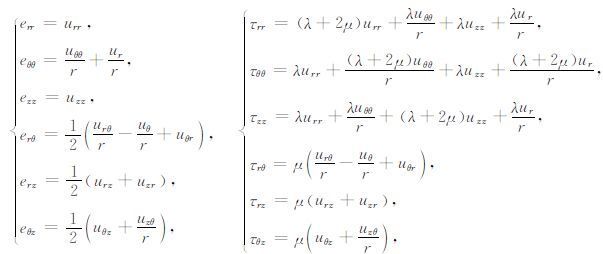 其中err,eθθ,ezz,erθ,erz,eθz为应变分量,τrr,τθθ,τzz,τrθ,τrz,τθz为应力分量,urr,uθθ,uzz,urθ,urz,uθz为位移的偏导数,λ,μ 为弹性常数. 根据应力张量可以计算断层面上的库仑应力变化[4, 36-37],如下式所示: