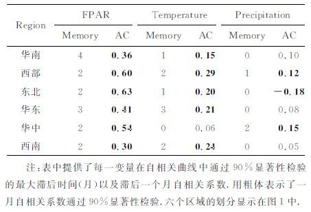 表 1 通过自相关系数(AC)对于中国六个区域中FPAR、气温和降水记忆时间尺度的估计 Table 1 Estimations of observed FPAR, surface air temperature and precipitation memory in six regions of China by calculating |