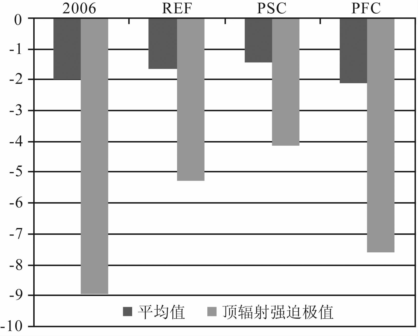 (4) REF和PSC 情景下辐射强迫平均值和极值都明显小于2006 年.PFC 情景下平均辐射强迫为-2.1 W/m2,大于2006年的辐射强迫,但极值小于2006年.