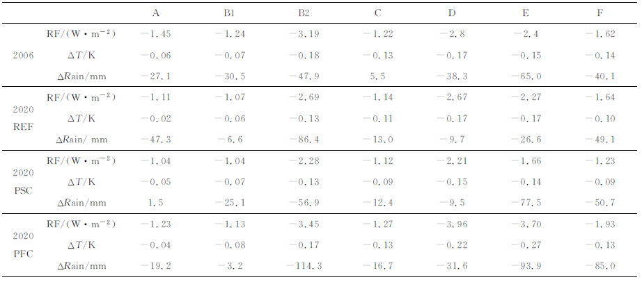 需要指出的是,本文的研究中只改变了区域内部的气溶胶排放,没有考虑未来全球排放改变所产生的大尺度气候效应及其可能的反馈,因此,估算的温度、降水变化,可能更多的只是局地的效应.另外,本文是在2006年同一气候背景下不同排放情景下的人为气溶胶气候效应的敏感性研究,对未来气候的准确预估需要在气候模式中同时考虑温室气体和气溶胶的作用.