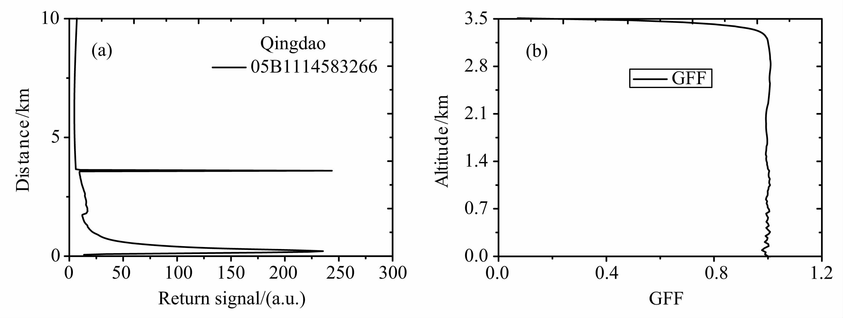 图 1 (a)青岛机载激光雷达实验数据;(b)几何校正因子 Fig. 1 (a)Experimental data from Qingdao of airborne lidar; (b)Geometric factor function (GFF) |