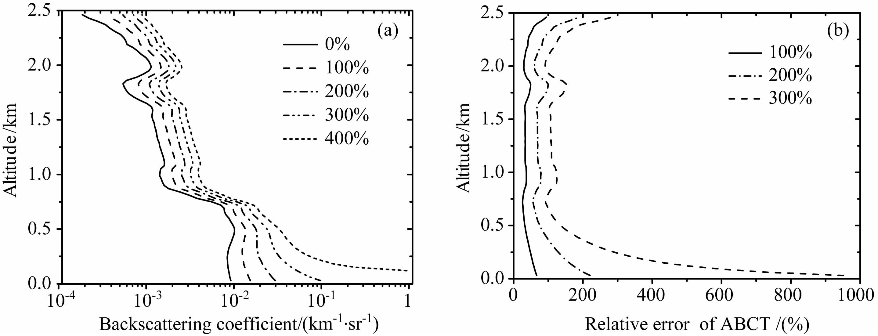 分别赋给标定值100%、200%、300% 和400%的误差,利用Fernald前向积分反演机载大气探测激光雷达模拟数据得到相应的ABCT 廓线,如图 9a所示,从图 9a 可以看出,当标定值存在100% ~400%的误差时,反演得到的ABCT 的误差不是很大,特别是地面附近,反演结果差别较小;定量分析表明(图 9b):当标定值存在400% 误差时,在0~7km的高度范围内,除个别点外,利用Fernald前向积分反演得到的ABCT 的相对误差在100% 以内;7km高度以上,反演得到的气溶胶后向散射系数相对误差在50%~400%之间.