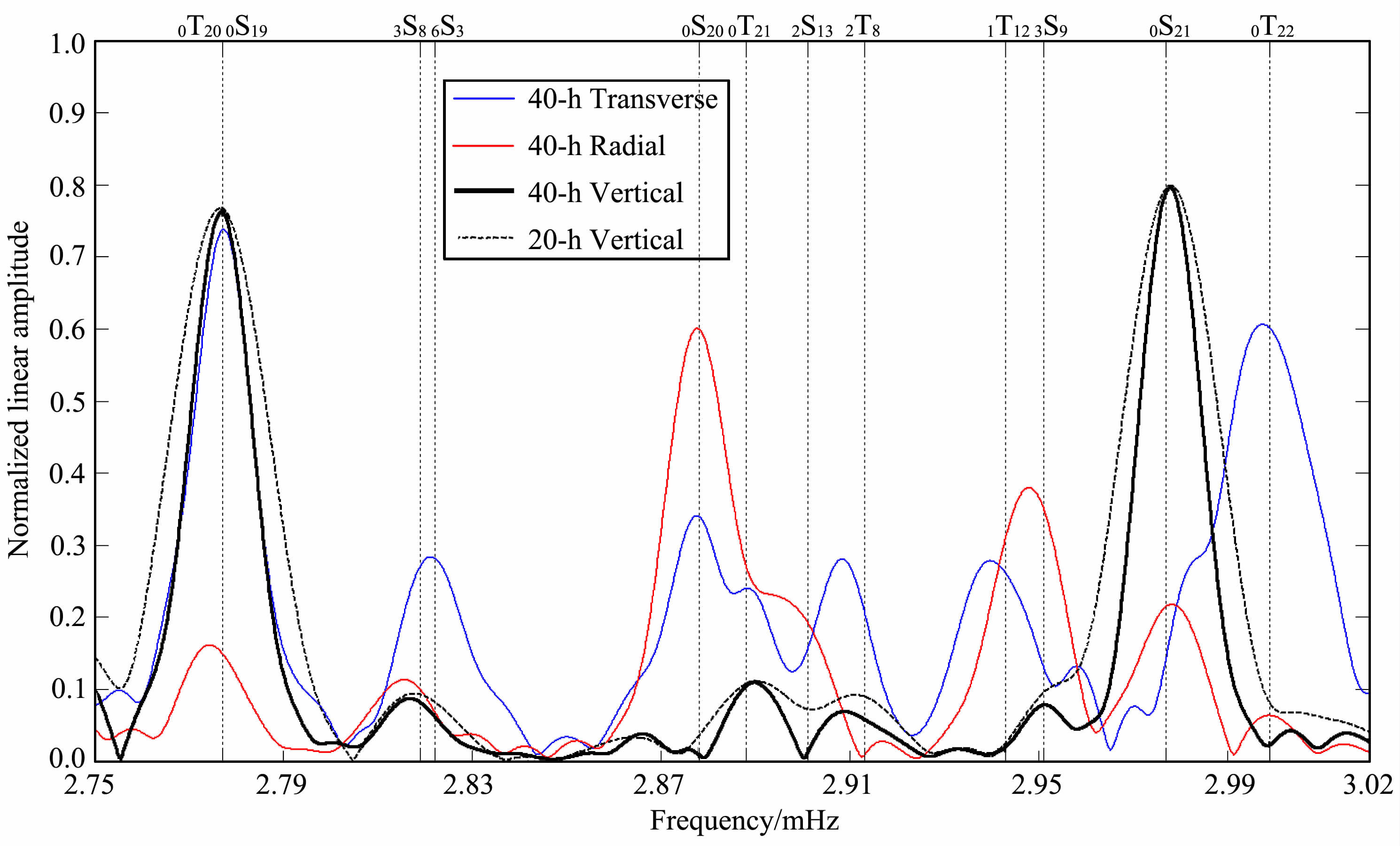 图 5 台湾地震台SSLB的LHZ观测记录的振幅谱 (a)2004-12-26 Mw9.2苏门答腊大地震后,在16h垂向观测记录中,各向异性耦合0S2-0T25非常显著,0T25的振幅大于0S25的振幅.在48h 观测记录中,0T25显著减小.(b) 2010-02-27 Mw8. 8智利大地震后,在18 h垂向观测记录中,耦合0S20-0T21非常显著,且0T21的振幅大于0S20的振幅,但0S21和0T22间却没有任何耦合迹象.在40 h观测记录中,0S20-0T21耦合完全消失.这些现象说明0S20与0T21的耦合是各向异性耦合.虚线表示由PREM模型[30]得到的简正模理论频率. Fig. 5 The amplitude spectra of LHZ records from the station SSLB of Taiwan (a)The anisotropy coupling between 0S25 and 0T25 are significant at 16 h LHZ spectrum from SSLB after the 2004-12-26 Mw9. 2 Sumatra earthquake. The 0T25 attenuates significantly at the 48 h spectrum. (b) Strong 0S20-0T21 coupling is observed at 18 h LHZ spectrum from SSLB after the 2010-02-27 Mw8. 8 Chile earthquake, and the amplitude of quati-0T21 is larger than that of 0S20,but no sign of 0S21-0T22 coupling is identified. The 0S20-0T21 coupling vanishes at 40h spectrum. These observations suggest that the coupling should be related to anisotropy structure. The dashed lines on the figure mdicate the frequencies of normal modes estimated according to the PREM model[30]. |