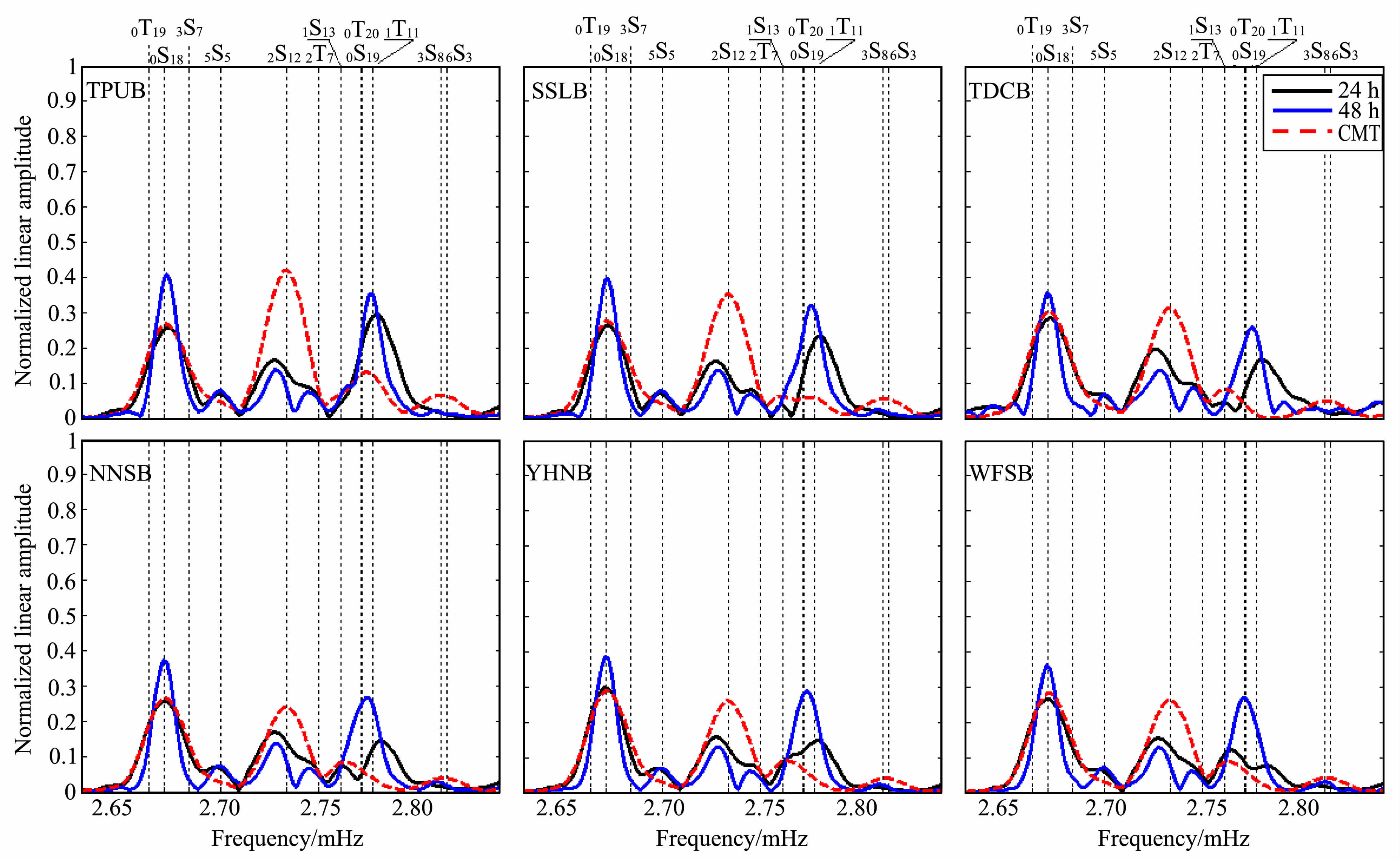 图 6 2010-02-27 Mw8. 8智利大地震后6个台湾宽频带地震仪LHZ记录的振幅谱 在24h观测记录中(黑线),耦合0S19-0T20在NNSB、YHNB以及WFSB中比较显著.在WFSB台,0T20的振幅明显大于0S19的振幅.0S18的观测值和CMT 自由振荡模拟值(红色)符合良好,而0S19的观测值和理论值显著不符.这一现象表明地球自转耦合很弱,0S19-0T20是各向异性导致的耦合.在震后48h的观测记录中(蓝色),各向异性耦合0S19-0T20消失,但各向异性耦合2S12-2T7更加显著.图中虚线表示由PREM 模型[30]得到的简正模理论频率. Fig. 6 The LHZ spectra from six seismic stations of Taiwan after the 2010-02-27Mw8. 8 Chile earthquake The 0S19-0T20 coupling is clearly identified on the 24 h spectra from stations NNSB,YHNB and WFSB,and the amplitude of quasi-0T20 is larger than that of 0S19 at WFSB. Note that the observed 0S18 fits the synthetic one well, but there is significant discrepancy between observed 0S19 and its synthetic, which suggest that rotational coupling s weak and 0S19-0T20 coupling s caused by the anisotropy. On the48-hour spectra from all six stations, the 0S19-0T20 coupling vanishes but the 2S12-2T7 coupling s more clearly dlentified. The dashed lineson the fgure indicate the frequencies of normal modes estimated according to the PREM model[30]. |