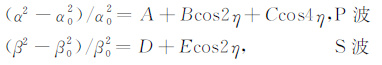 其中α 和β 分别为P波和S波的传播速度,α0 和β0分别为P波和S 波在横向各向同性地球参考模型中的传播速度.η 为地震波传播方向与各向异性对称轴的夹角.B,C,E为各向异性速度扰动参数.A,D为各向同性(横向非均匀性)速度扰动参数.由于Ccos4η 很小,参数C的影响通常可忽略不计.