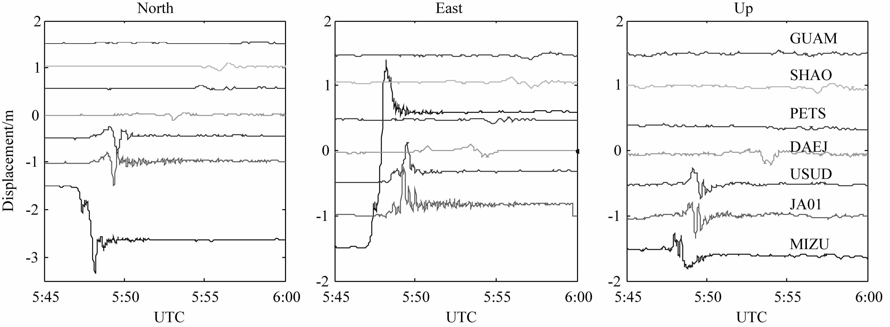 基于高频GPS可以直接获得地表的真实位移,捕获强震时复杂的地表运动时序,为研究断裂扩展机理提供可视化帮助.图 2 自上而下依次为所有测站北、东、垂直方向的地表同震位移时间序列,横轴代表UTC 时间,纵轴代表相应的位移量,为便于描述地震波的传播过程,将所有测站依震中距大小排列显示其震前、震时及震后的位移变化.从图中可以看出地震发生后,距离震中最近的MIZU 站最先感知,随后地震波传至其他各站.各站各分量在地震到时均有不同程度的震动,其震动大小主要取决于震中距及地震带的破裂方向.尤其以震中距较小的MIZU 站(~140 km)、JA01 站(~390 km)及USUD 站(~450km)最为明显,对于数千千米之外的DAEJ站、SHAO站、PETS站和GUAM 站利用高频GPS同样能够监测到其地震波信号.此外,由于破坏力极强的剪切波(S波)主要造成水平向的挤压和扭动,因此,水平向位移较竖向位移变化更加显著.