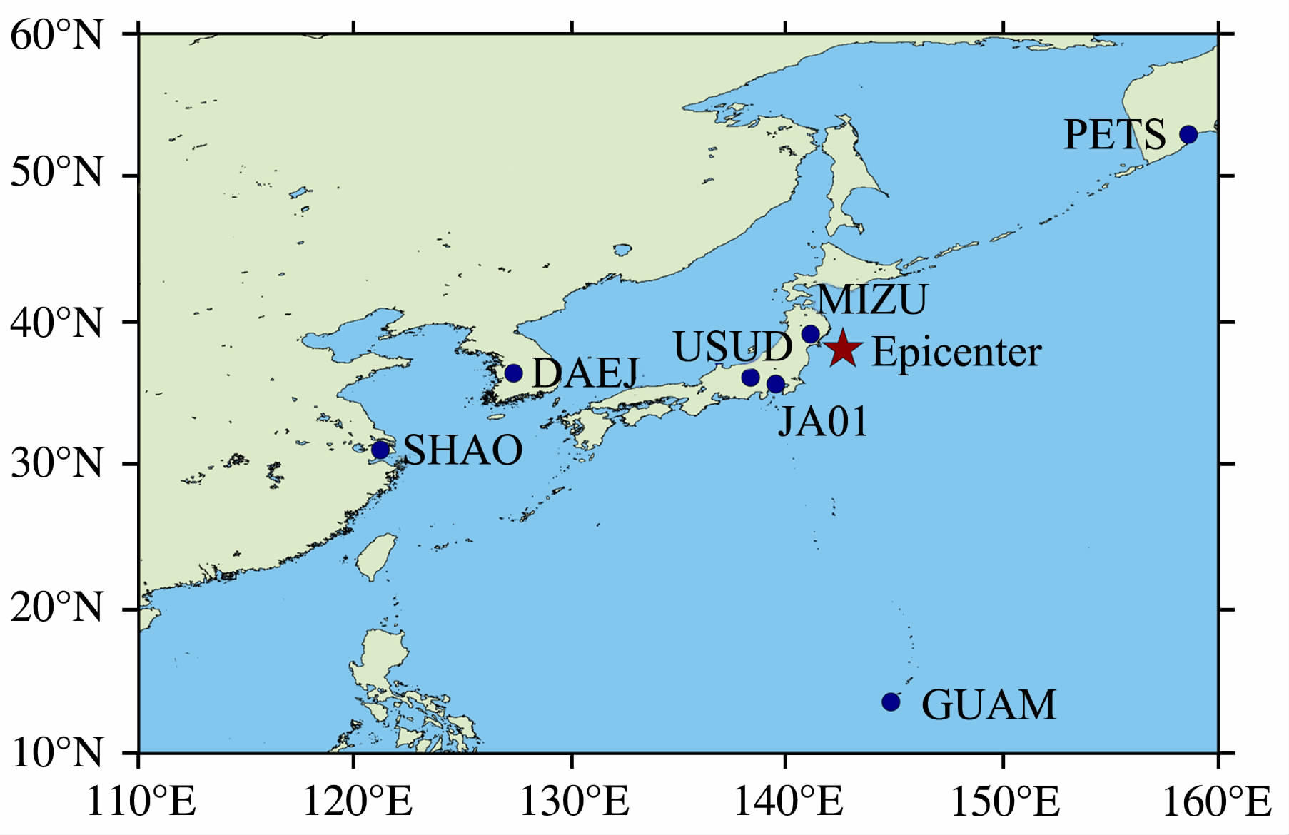 图 1 震中及高频GPS测站分布示意图 Fig. 1 Location of the HR-GPS stations and the epicenter of the M9.0 Tohoku earthquake |