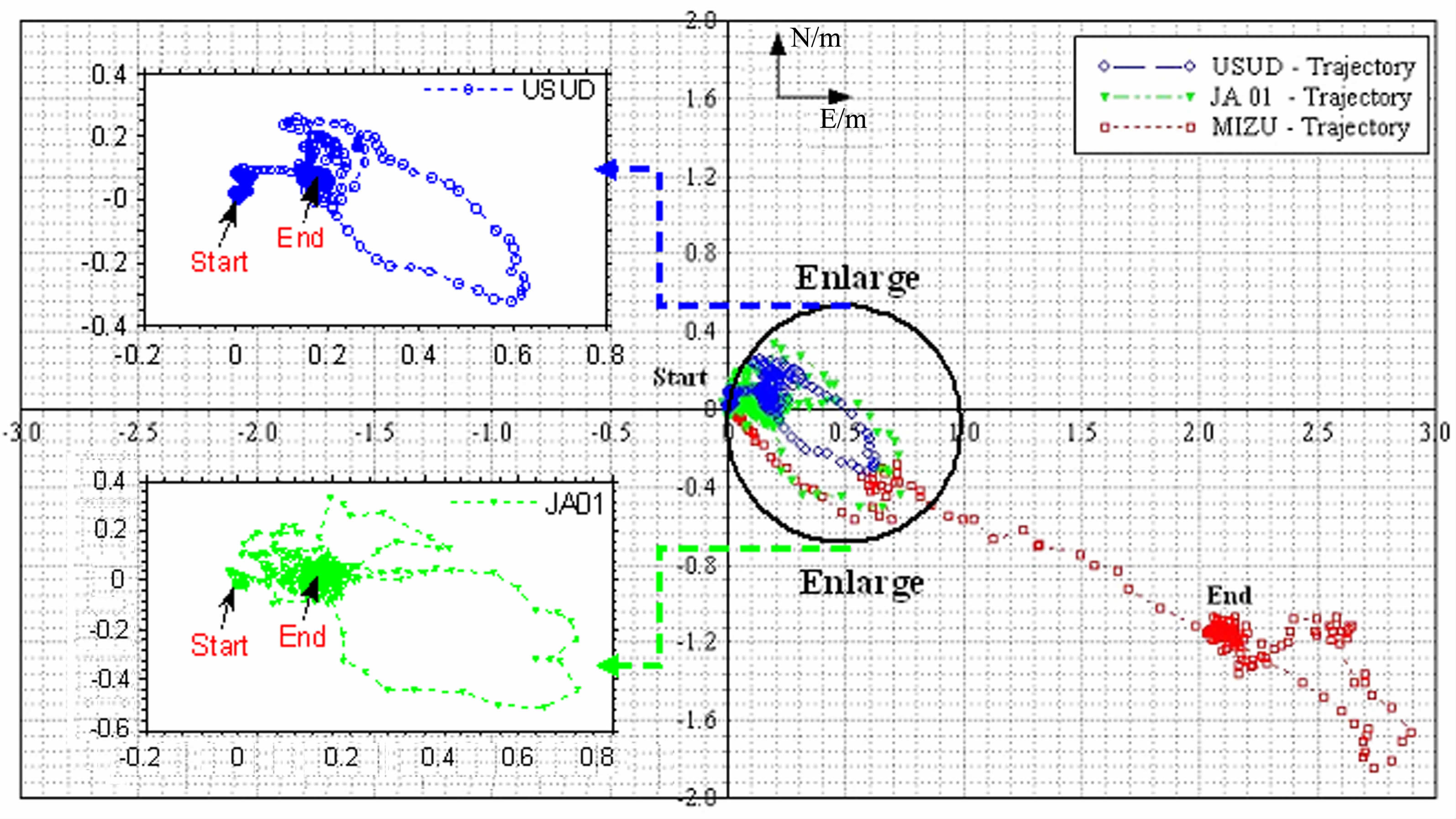 图 3中坐标原点为各站震前初始位置(Start),地震波(尤其是横向剪切波)到达时测站开始朝东南方向发生剧烈的抖动,其中MIZU 站的最大位移达到东向3m、南向2m左右;随着地震波的衰减,测站位置发生回弹至最终点位(End).相对于MIZU站,JA01、USUD 站的位移量级较小,将其运动轨迹放大(Enlarge)进行图示,得到图 3中左半部分.表 1说明强震已经造成这些测站产生了永久性位移.其中MIZU 站向南偏移1.133m, 向东偏移2.130m, 垂直方向也向下沉降0.1m 左右.其他测站也呈向东漂移和向下沉降的趋势,这在一定程度上也反映强震造成日本所在的板块整体朝东运动,并略有沉降.