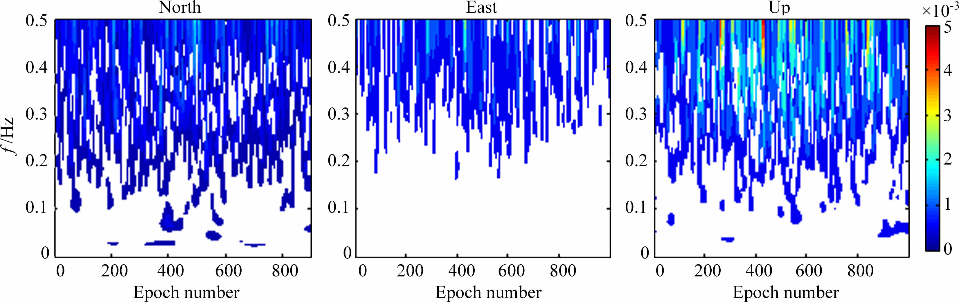 由图 5、6所知,地震波初至时,N、E、U 三个方向在时频域内均发生了较大的能量突变,且随着后续S波、面波的相继到达,能量逐渐增强至最大,并随着地震波的衰弱逐渐消退.基于S变换的P 波拾取结果如表 2所示,受GPS采样率(1Hz)的限制,P波拾取精度仅能精确到秒级.由N、E、U 三个方向拾取的P 波初至时刻不尽相同,差异达到数秒,且水平向较垂直方向的拾取时刻偏早.