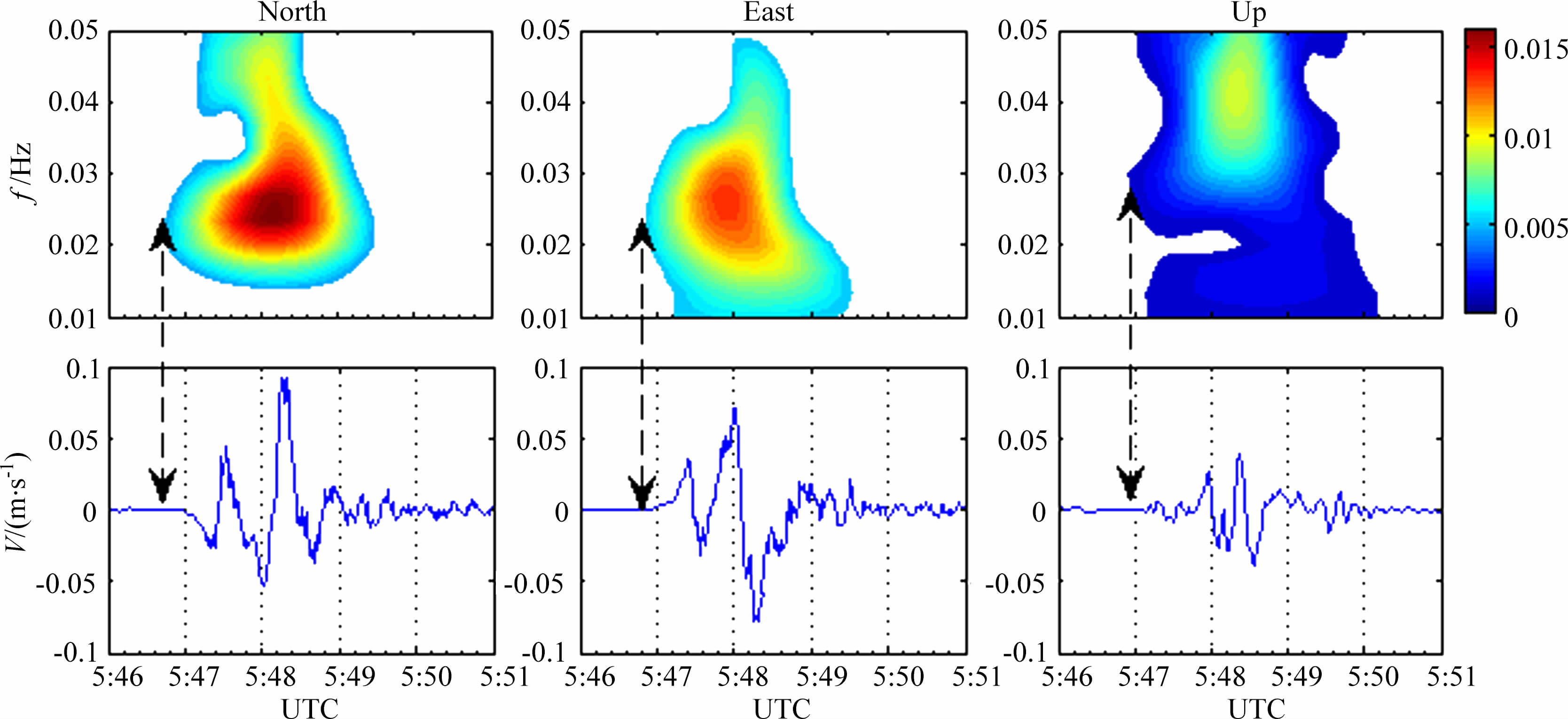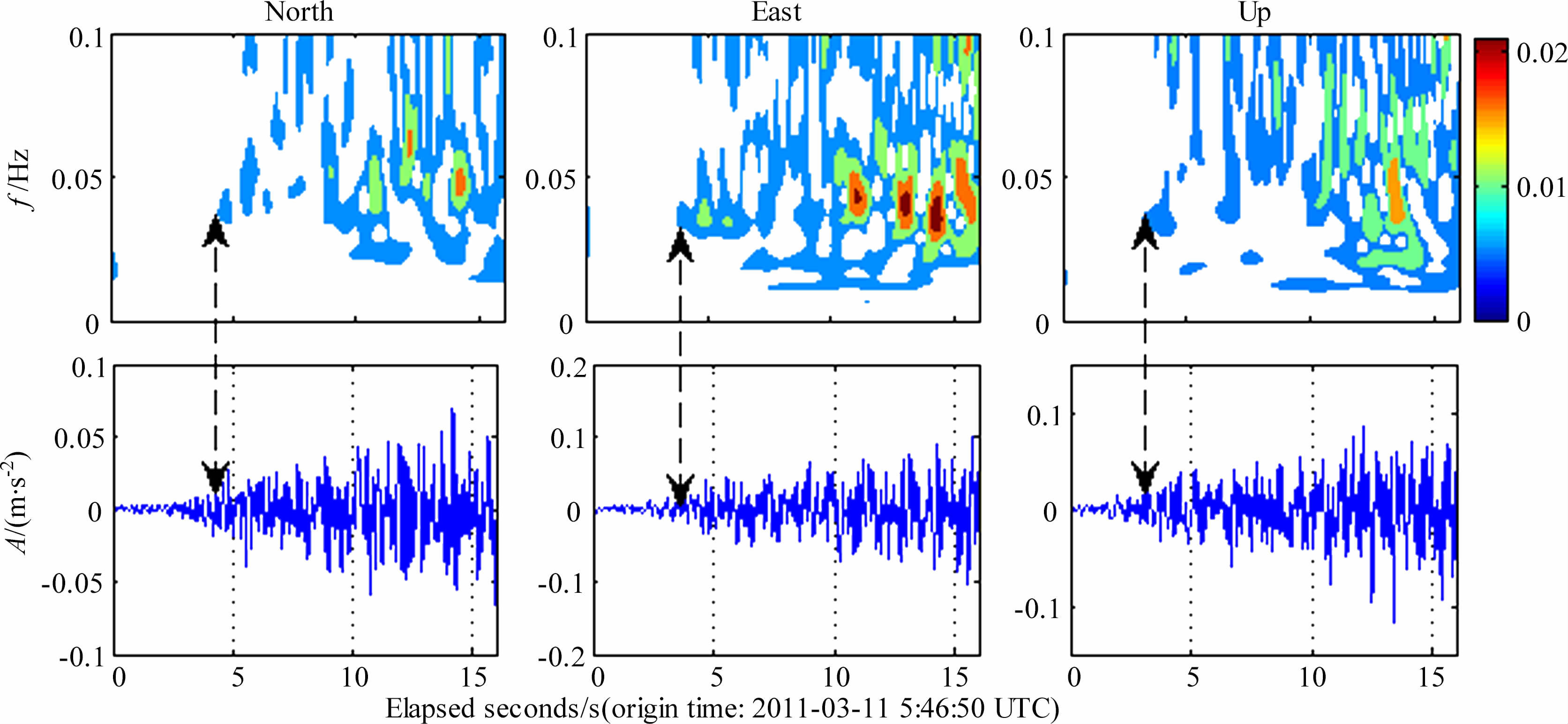 图 7 中从左向右、自上而下依次为N、E、U三个方向对应的时频谱图和加速度时序图.双向竖线表示P波初到时刻(具体时刻如表 2 所示,精确到0.01s),且P波的归一化频率在各方向上具有较好的一致性(0.02~0.03Hz).
