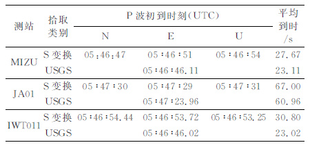 4.4 拾取结果验证及误差分析为验证本文所提方法的正确性及有效性,结合USGS网站提供的P 波初到时刻作为参考值,对比分析各站的拾取精度,结果如表 2所示.比较表 2中各站S 变换拾取的P 波初到时刻与USGS 提供的参考值发现,几乎所有测站拾取的结果均比USGS提供的结果晚5~8s 左右,对于高频GPS 测站(MIZU、JA01),其水平向拾取精度明显优于高程方向.比较MIZU(高频GPS)与IWT011(地震仪)这两个相邻的测站,发现其地震波平均到时也相差2~3s.究其原因,这是因为:其一,受GPS本身观测精度的限制,基于GPS技术获取的地震波信噪比不及地震仪数据,导致使用S 变换不容易区分背景噪声与微弱的地震信号(尤其是垂直方向);而作为区分背景噪声与地震信号的能量阈值选取极其关键,较小的阈值差异可能引起较大的拾取误差(达到数秒);且不同方向对地震波初至的敏感程度不同,对其简单的求取平均到时也会引起拾取结果产生一定的偏差.其二,尽管已将MIZU 与IWT011 的时间归化至UTC 时,但时钟本身的误差导致两者并非严格同步,因此基于GPS和地震仪的拾取结果也会有所差异.此外,由于USGS 提供的参考值是基于IASP91地球模型计算得到的理论值,它并未考虑椭球改正及严密的介质传播速度等信息,可能会与实际情况存在较大的差异[16].因此,本文采用S变换拾取的地震波初至与USGS 提供的参考结果也并非完全一致.但总体而言,基于GPS 与地震仪数据在震相识别时具有较好的吻合性.