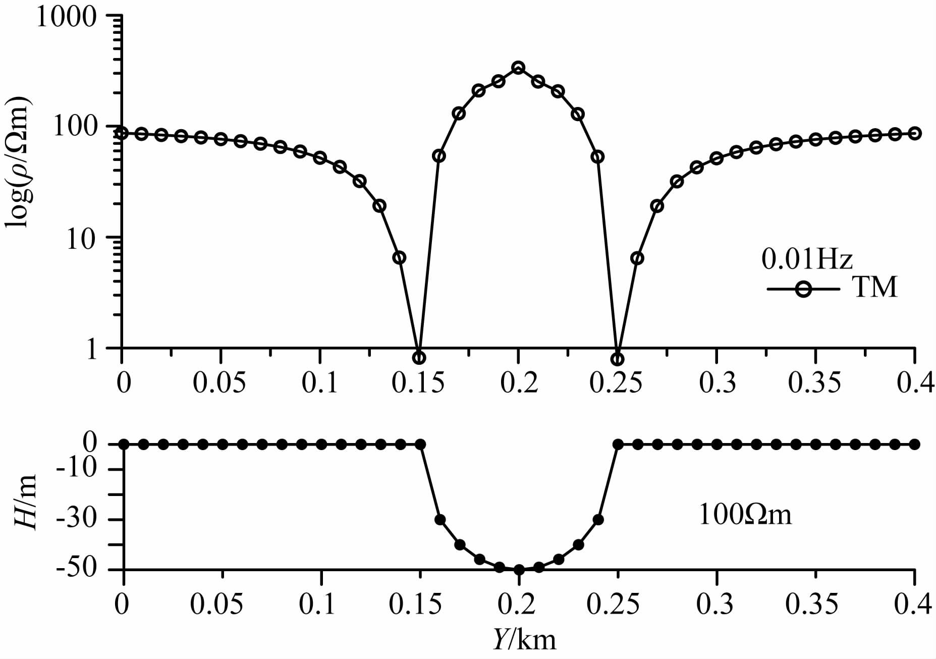 5.2 地形模型如图 6 下部所示为圆柱凹陷地形模型,Wannamaker等[1]和徐世浙等[20]在文献中对这个模型做过模拟.测点区域为0~0.4km, 点距为10m, 共41个测点,圆半径为50 m, 频率为0.01 Hz, 计算TM 模式下视电阻率.