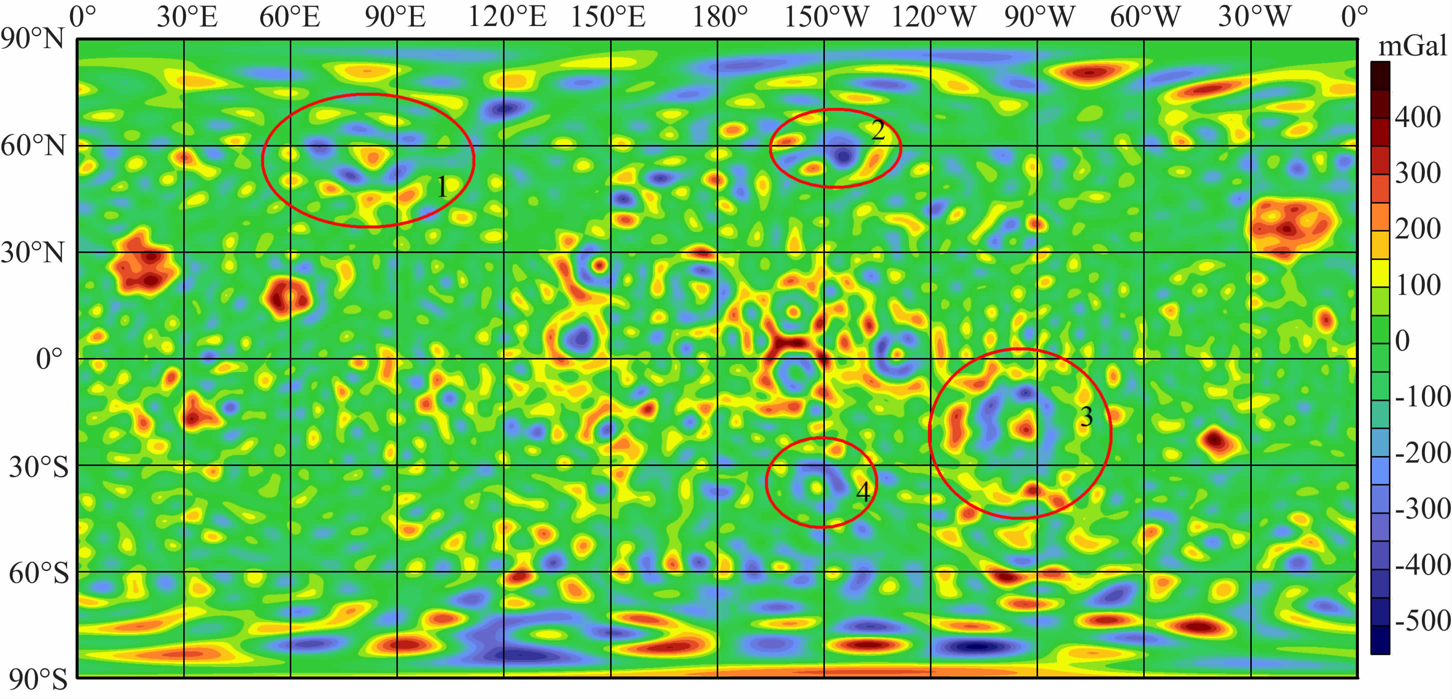 本文利用LG-53 并借助月球地形模型STM359_grid02_180(180阶次)计算得到月表重力异常场图并与Yan 等[18]建立的CEGM-01 月表重力异常场图进行对比,如图 10、11 所示.首先,CEGM-01月表重力异常图(图 11)存在许多在全球范围内与经线平行的线性重力异常特征.实际上,这种线性的重力异常特征是不存在的.出现这一现象的原因类似于上面提到的接近理论阶次时重力异常图所反映出的高频噪声.也就是说CEGM-01 所计算出的50阶次月球重力场的实际有效阶次达到不了50阶次,后几个阶次的结果误差较大.与此同时,还可以看出,LG-53 无论是在月球高纬度地区还是在月球背面反映的重力场信息都能够较CEGM-01 结果更精确.首先最明显的是在大于北纬30°地区的洪保德海(56.8°N,81.5°E)(图 10、11 的区域1) 的重力异常在LG-53 中有反映,而在CEGM-01 中却非常不明显.同样的,在背面也是如此,如伯克霍夫坑(54.7°N,114.6°W)(图 10、11 的区域2)的重力异常和正对东方海下面的门德尔-罗德伯格坑(50.0°S,94.0°W)(图 10、11的区域3)的重力异常,以及阿波罗坑(36.1°S,151.8°W)(图 10、11的区域4)的重力异常也都有类似的特征.诸如此类,因此LG-53所建立的月表重力异常在大于南北纬30°地区和在月球背面地区都有明显优势.