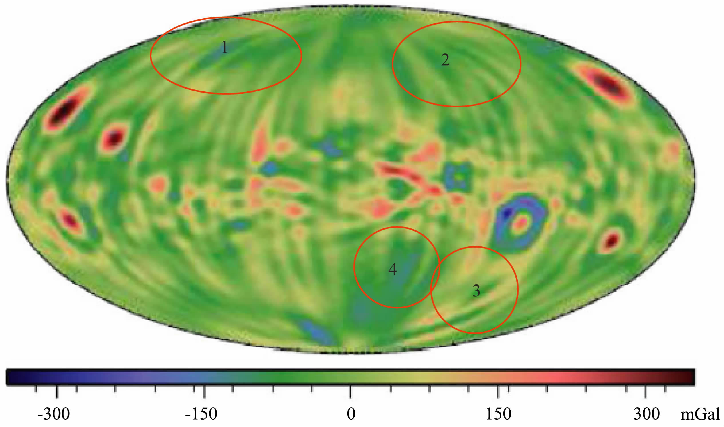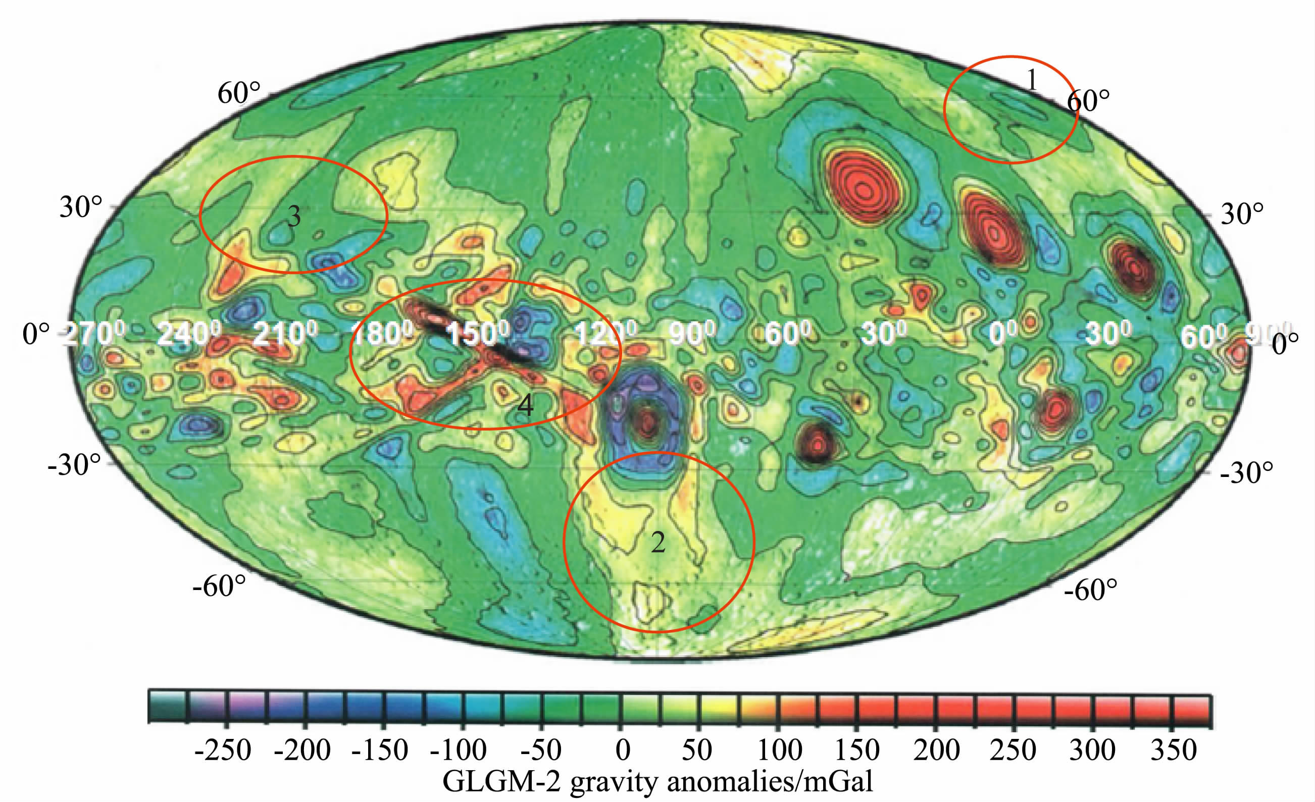 与GLGM-2所建立的自由空气重力异常图(图 7)对比发现:图 7中区域1 的位置在图 4 中应该对应的是洪保德海(56.8°N,81.5°E).在图 4中可以看到洪保德海的重力异常特征,而在GLGM-2(图 7)中却没有显示出来;同样,图 7中的区域2和区域3的位置在图 4中分别对应的是门德尔-罗德伯格坑(50.0°S,94.0°W)和莫斯科海(27.3°N,147.9°E),在图 7 中也都没显示出来.图 7 中的区域4 对应于图 4 的克罗列夫坑(4.0°S,157.4°W)和赫兹斯朋坑(2.6° N,129.2°W).在图 4 中可以很清晰地看到它们的重力异常特征,而在GLGM-2 中的这两个坑的重力异常已经混成了一种类似线状的重力异常特征,很容易产生错误的解释.以上说明GLGM-2 在大于南北纬30°的地区已经不能反映出有效的重力异常了,同时在月球背面的结果也不能作为解释的依据,甚至有些地方是错误的,而LG-53 建立的自由空气重力异常的结果却能反映出明显而清晰的重力异常特征.