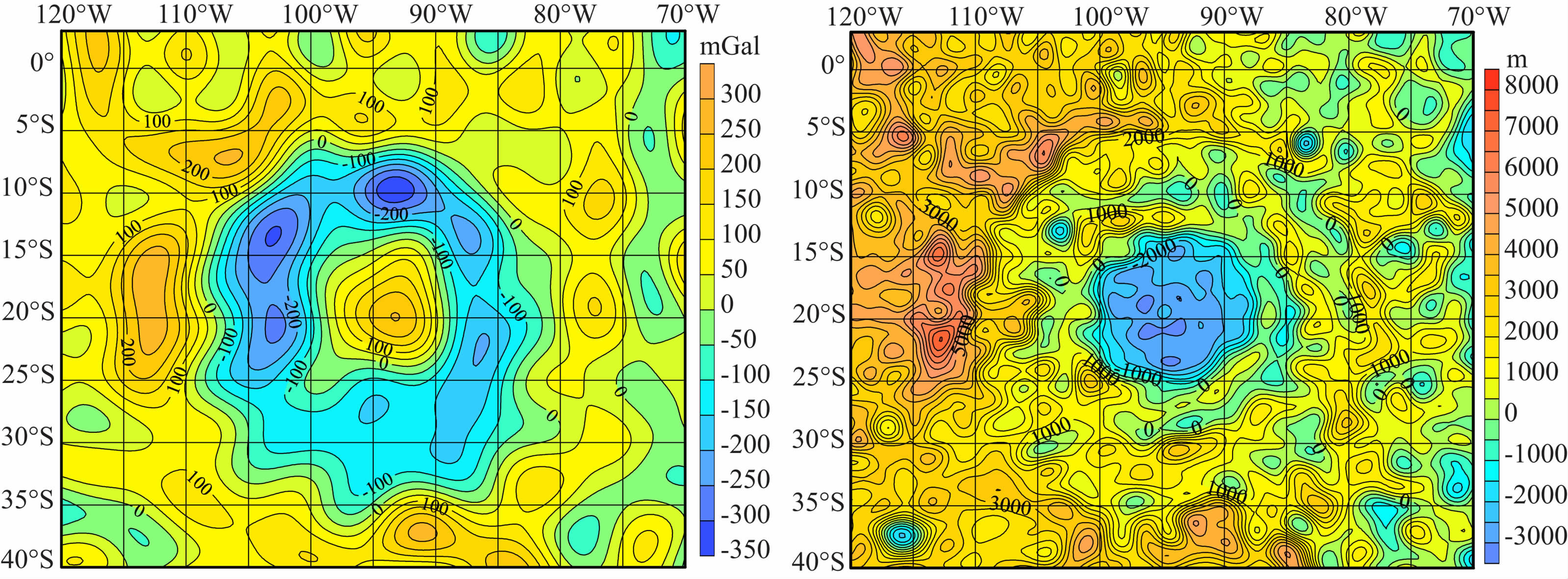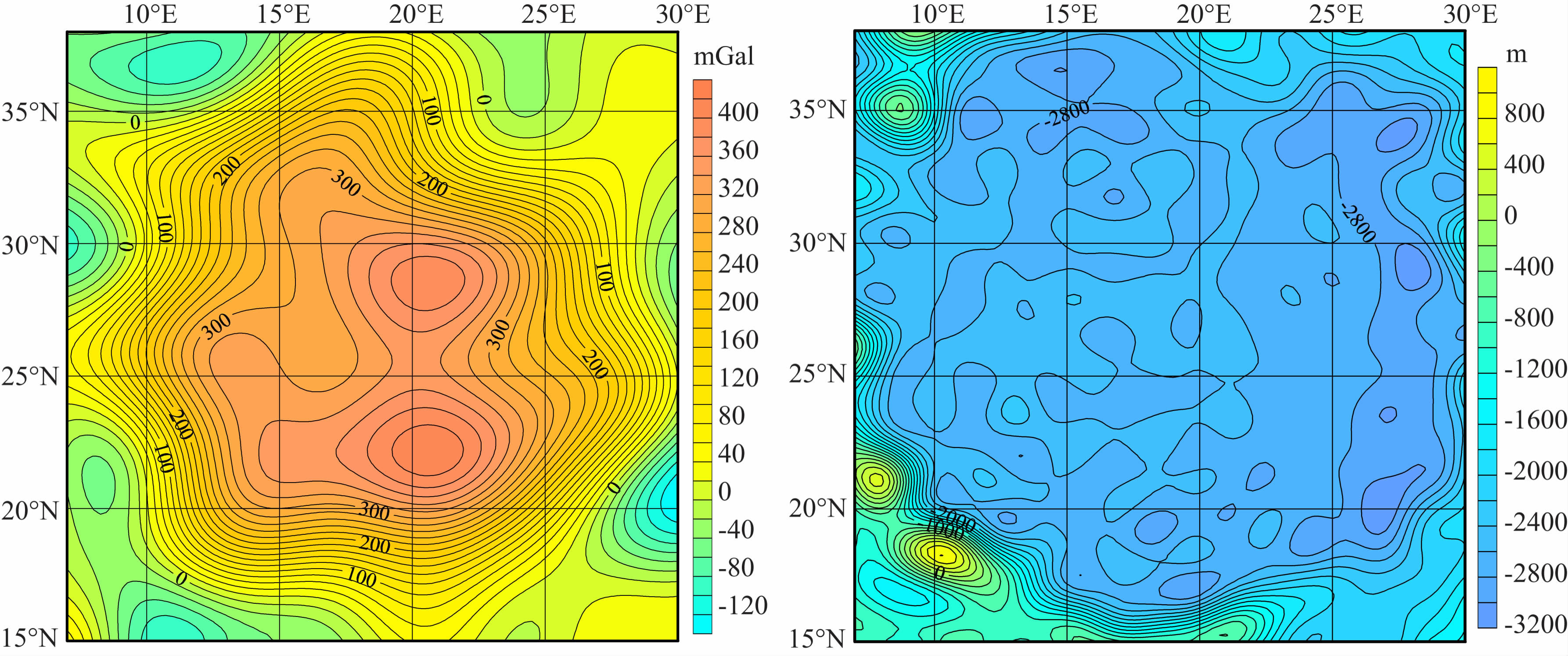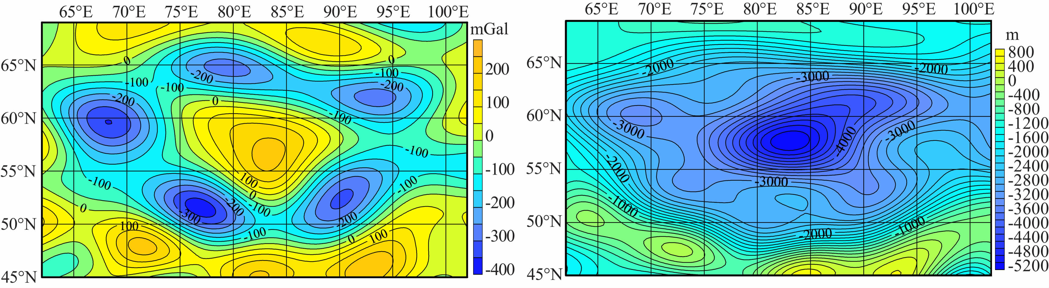 (2) 对于地形来说,对应于这些高重力异常区域的是低矮的地形,且是一个面积较大的平坦区域;