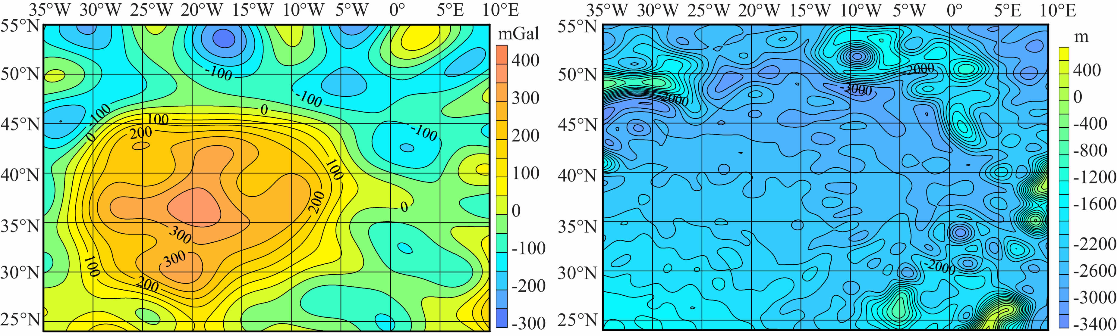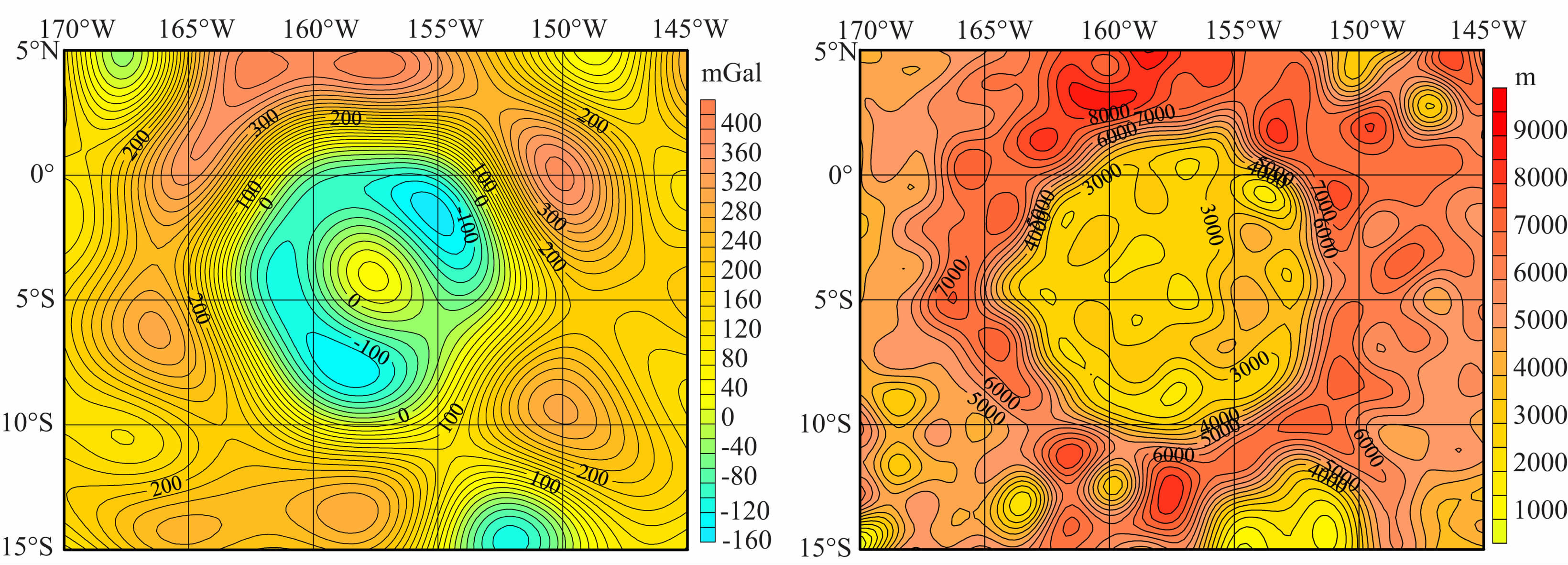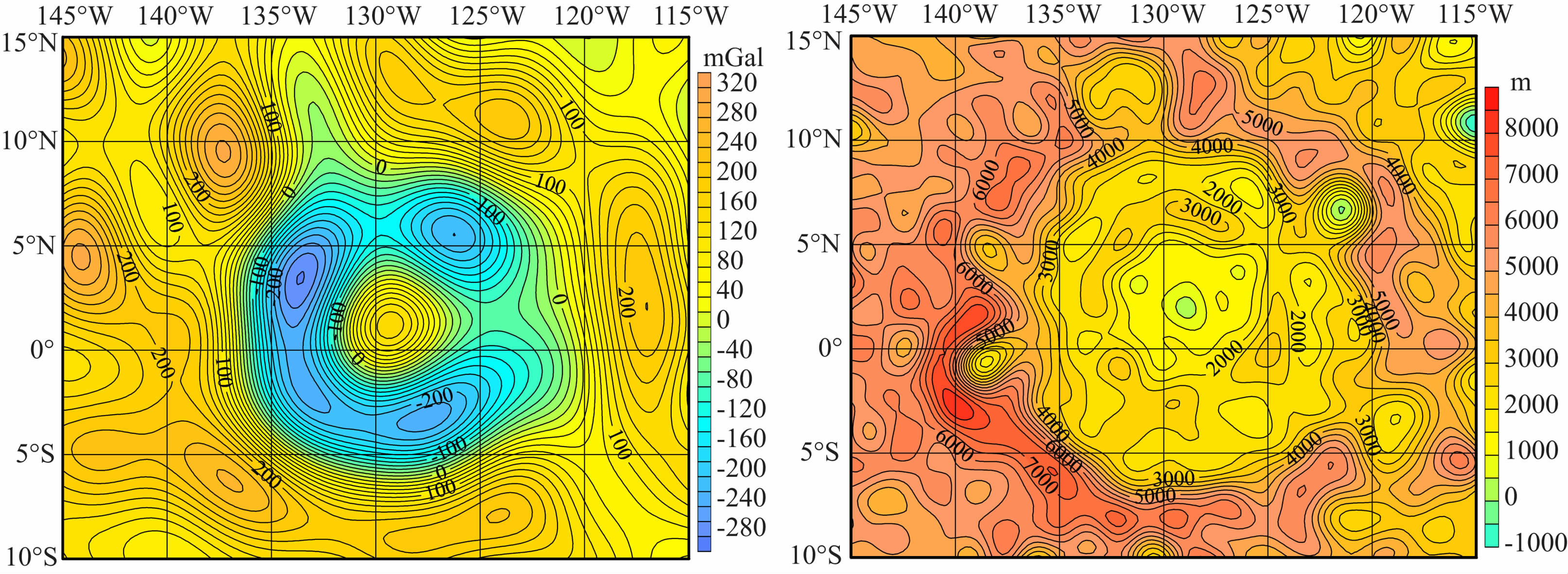 (2) 对于地形来说,对应于这些高重力异常区域的是低矮的地形,且是一个面积较大的平坦区域;