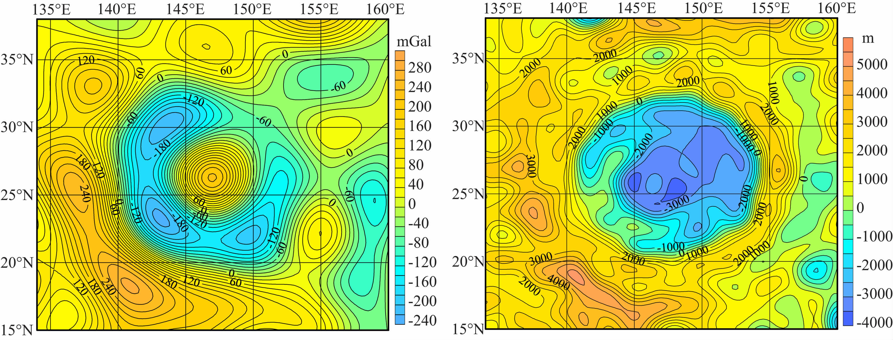 与上面第二种不同的是,虽然东方海也具有双环型重力异常特征,即最外圈是高重力异常环,内部是低重力异常环,最中心是一个高重力异常点,但是最大不同来自地形的差异.东方海的地形特征是多环型的.最外环是高地形,然后是低地形、再是高地形,中间又是低地形,且中心低地形的范围较大.