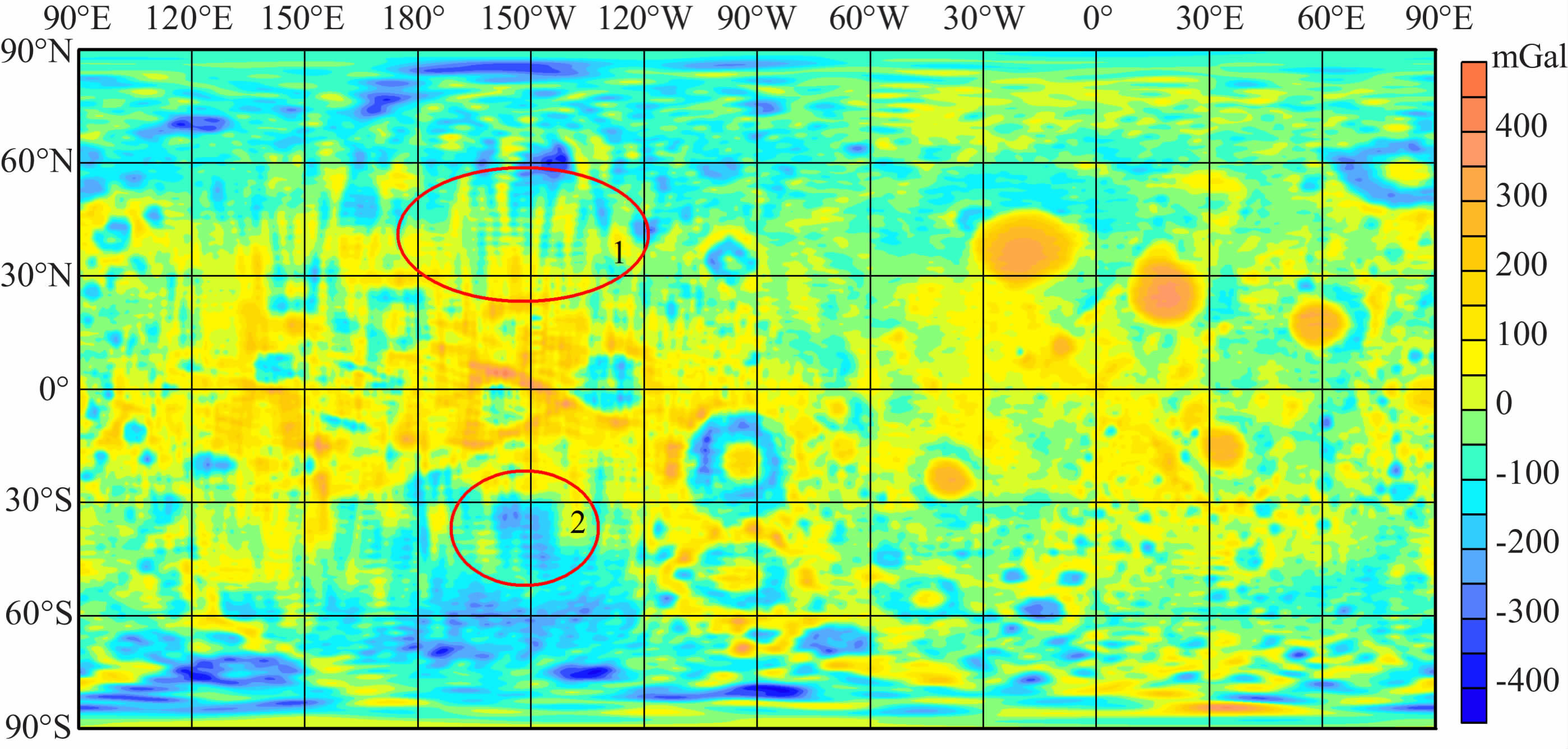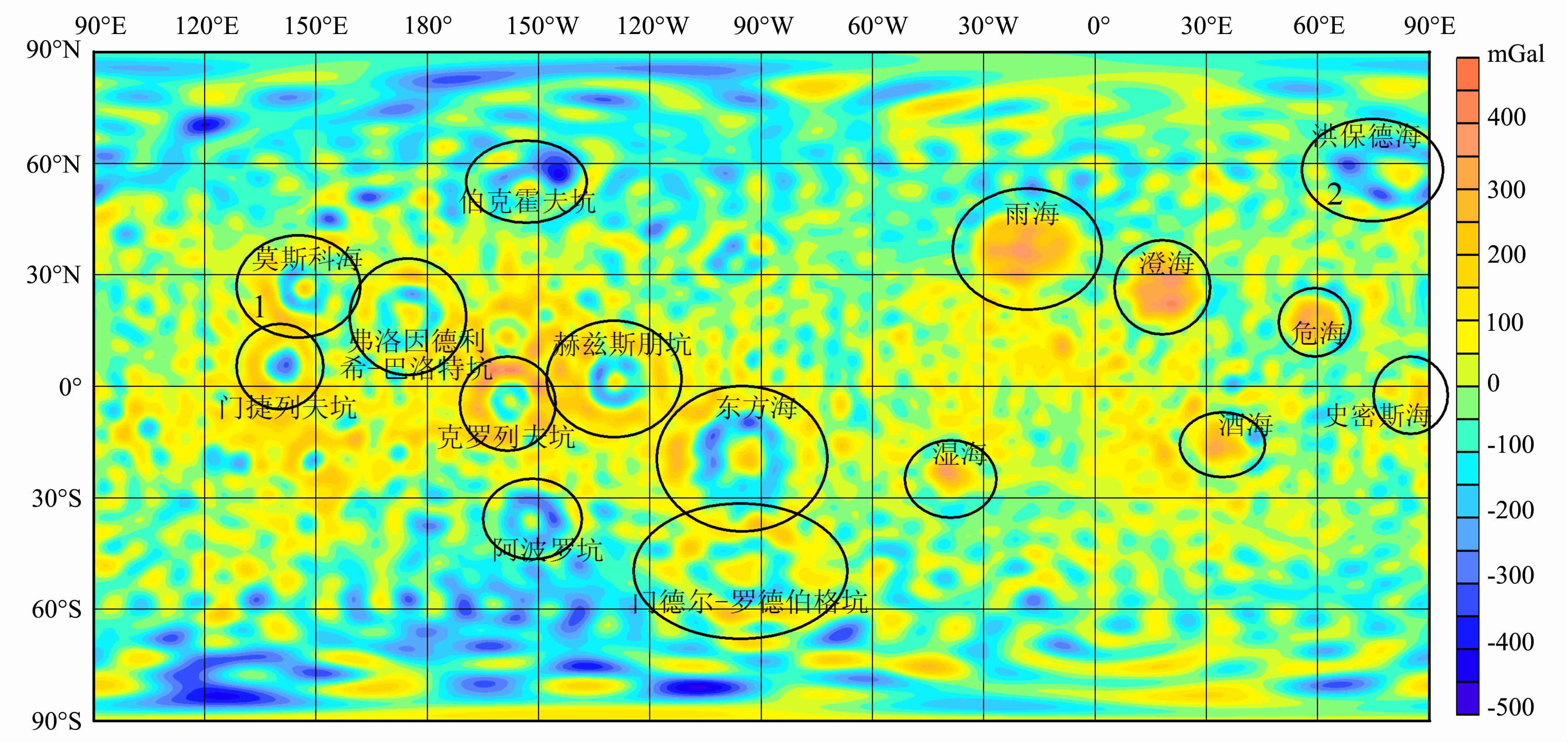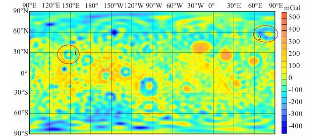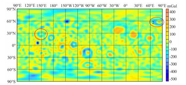 图 3 50阶次月球自由空气重力异常场(区域1为莫斯科海,区域2为洪保德海) Fig. 3 A map of free air gravity anomaly field of the moon at degree 50 (Mare Mosco-viense in the 1st zone,and Mare Humboldtianum in the 2nd zone) |