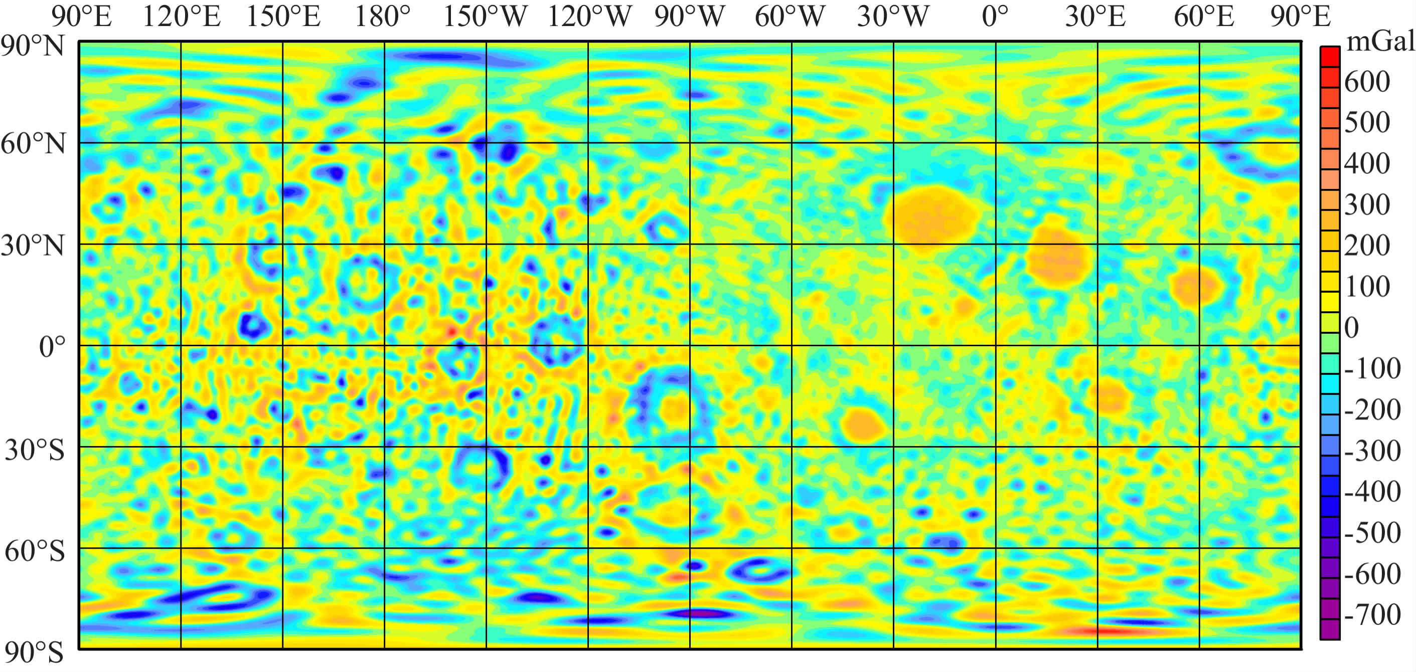 图 7 GLGM-2(70th阶次)建立的自由空气重力异常图[8] Fig. 7 A map of free air gravity anomalies for GLGM-2 model (70th degree) |