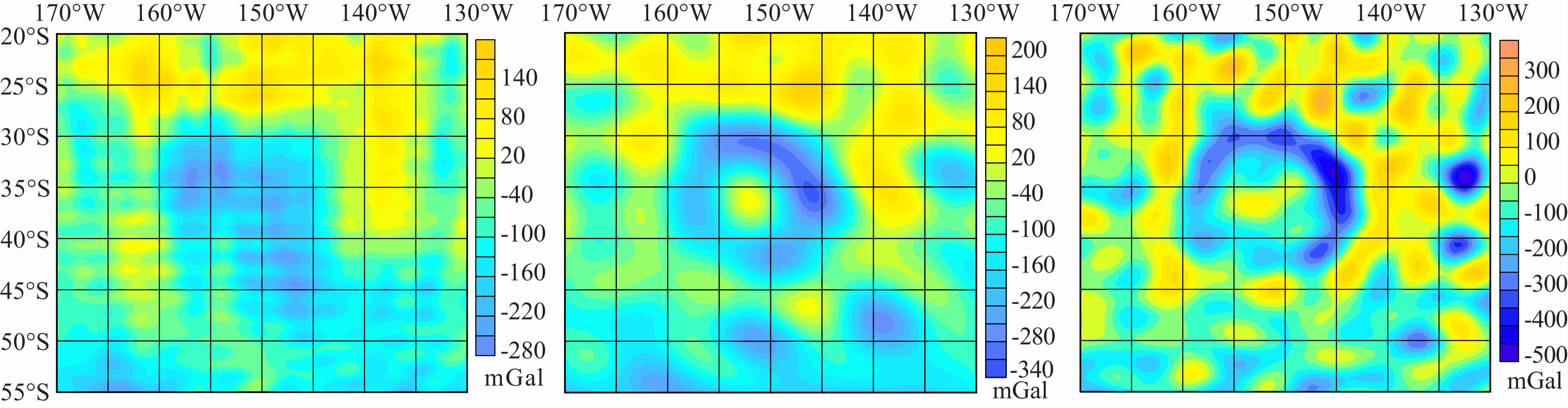 图 9 Apollo坑自由空气重力异常(左:LP165P;中:LG-53;右:SGM90d) Fig. 9 Free air gravity anomalies in Apollo crater for (Left: LP165P; Middle: LG-53; Right: SGM90d) |