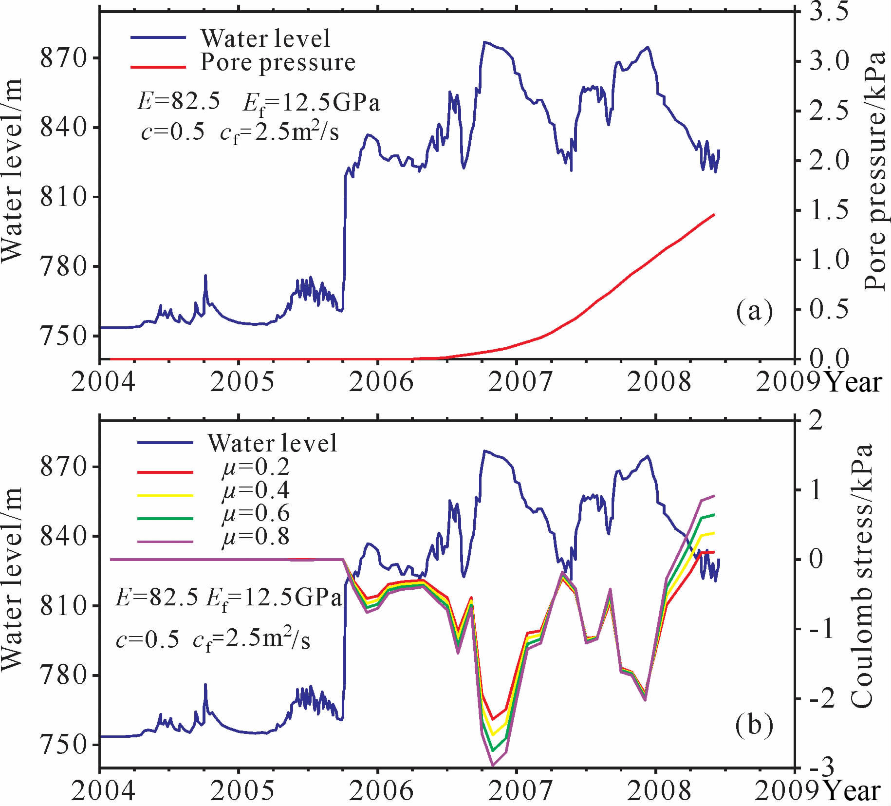 图 6 模型4计算得到的震源处孔隙压力和库仑应力随水库水位变化图 Fig. 6 The pore pressure and Coulomb stress vary with the water level at the hypocenter of Wenchuan earthquake for the model 4 |