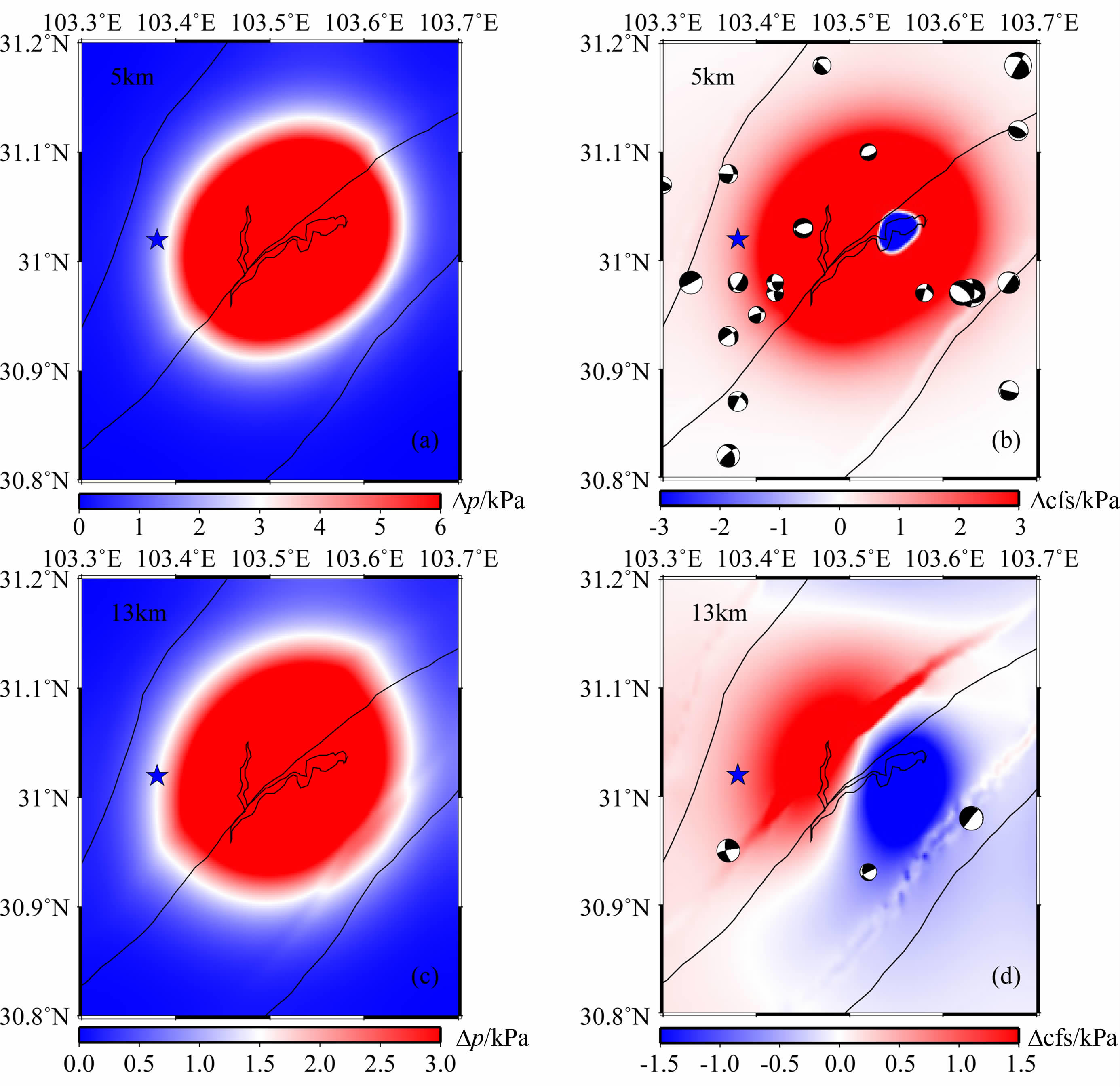 图 7 模型4计算得到的汶川地震发震时刻不同深度上的孔隙压力和库仑应力分布图,其中摩擦系数取为0.6.蓝色五角星为汶川地震震中,(b)图中地震震源机制解为研究区域内震源深度小于10 km、震级大于2.2级的所有地震,(d)图中地震震源机制解为研究区域内震源深度大于10 km、震级大于2.2级的所有地震 Fig. 7 Distribution of the pore pressure and Coulomb stress at different depth when the occurrence of the Wenchuan earthquake for the model 4 (the friction coefficient is 0.6).The blue pentagram indicates the epicenter of Wenchuan earthquake.The depth of the earthquakes shown in Fig. 7b and Fig.7d is less than 10 km and more than 10 km,respectively.The magnitude of the small earthquakes shown with focal mechanism is larger than 2.2 from the August,2004 to the occurrence of Wenchuan earthquake |