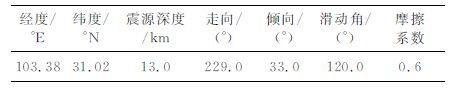 汶川地震后,国内外学者都在第一时间进行波形反演给出了地震的震源破裂模型,各个模型在断层参数上差别不大[15, 23](http://earthquake.usgs.gov/eqcenter/eqinthenews/2008/us2008ryan/finite_fault.php[2008-12-10]).但是对于震源深度,各个研究结果差别较大.之后,四川省地震局根据已有的所有资料又重新进行了定位,给出了更可靠的震源位置.本文中我们选取USGS 的断层参数,同时采用新的地震定位结果.计算库仑应力采用的断层参数如表 2.需要说明的是对于模型1-3,摩擦系数均为0.6,而模型4中摩擦系数采用了不同的值.