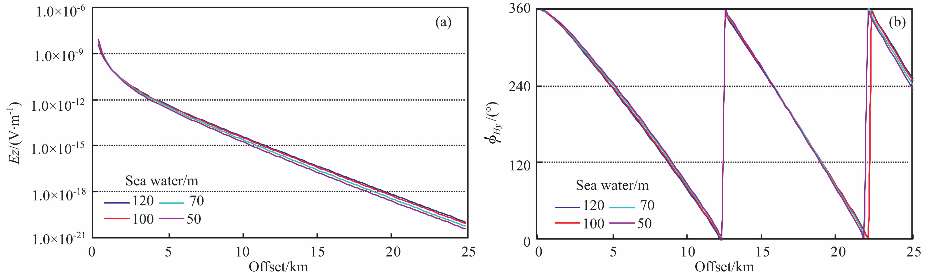 为了考察更浅水深时电磁场的响应特征,我们进一步考察了源放置于海底上方25 m 处,接收器置于海底,水深在50、70、100m 和120m 时电磁场的响应.Fig. 6(a, b)给出了源距海底25m, 接收器置于海底,磁场Hy分量在水深为50、70、100 m 和120m 四个不同深度时的幅度和相位曲线,激发频率为0.25Hz.图中看到,在这四个水深上,空气波占优的临界偏移距明显变小,在近2.5km 处幅度曲线斜率均出现突变,相位相位曲线在空气波出现的偏移距上发生突变,而且,空气波占主导时相位曲线变得平坦.