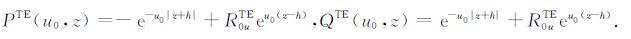 设坐标原点位于海水与海底地层的交界面,由两种模式的电场和磁场切向分量连续性条件得到TM 和TE 模式电磁场的上行和下行反射和透射系数为