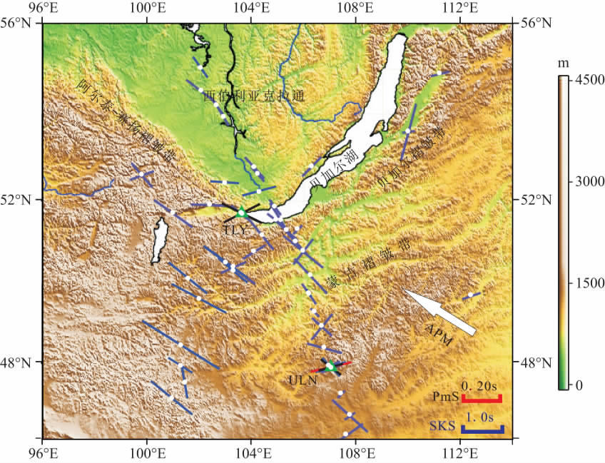图 1 贝加尔裂谷区域构造及剪切波分裂测量综合示意图 绿色三角表示本次研究使用的固定台站,白色小圆圈表示流动台站,白色箭头表示欧亚绝对板块运动方向;黑色线段表示固定台站SKS波分裂测量结果,蓝色线段表示流动台站SKS分裂测量结果,红色线段表示PmS分裂测量结果;其中,线段方向表示快波方向,长度代表分裂时差.流动台站SKS分裂测量数据来自http://www.gm.univ-montp2.fr/splitting/DB/. Fig. 1 The regional structure in the Baikal Ritt zone and the global shear-wave splitting measurements The green triangle denotes long-term-station used rn this study, while the small white circle denotes mobile station.The direction of the white arrow represents the absolute-plate-motion orientation of Eurasian Plate.The black line denotes SKS splitting measurement of long-term-station, while the blue denotes that of mobile station, and the red denotes the PmS splitting measurement.The direction of each line represents the orientation of fast wave, and the length represents delay time. |