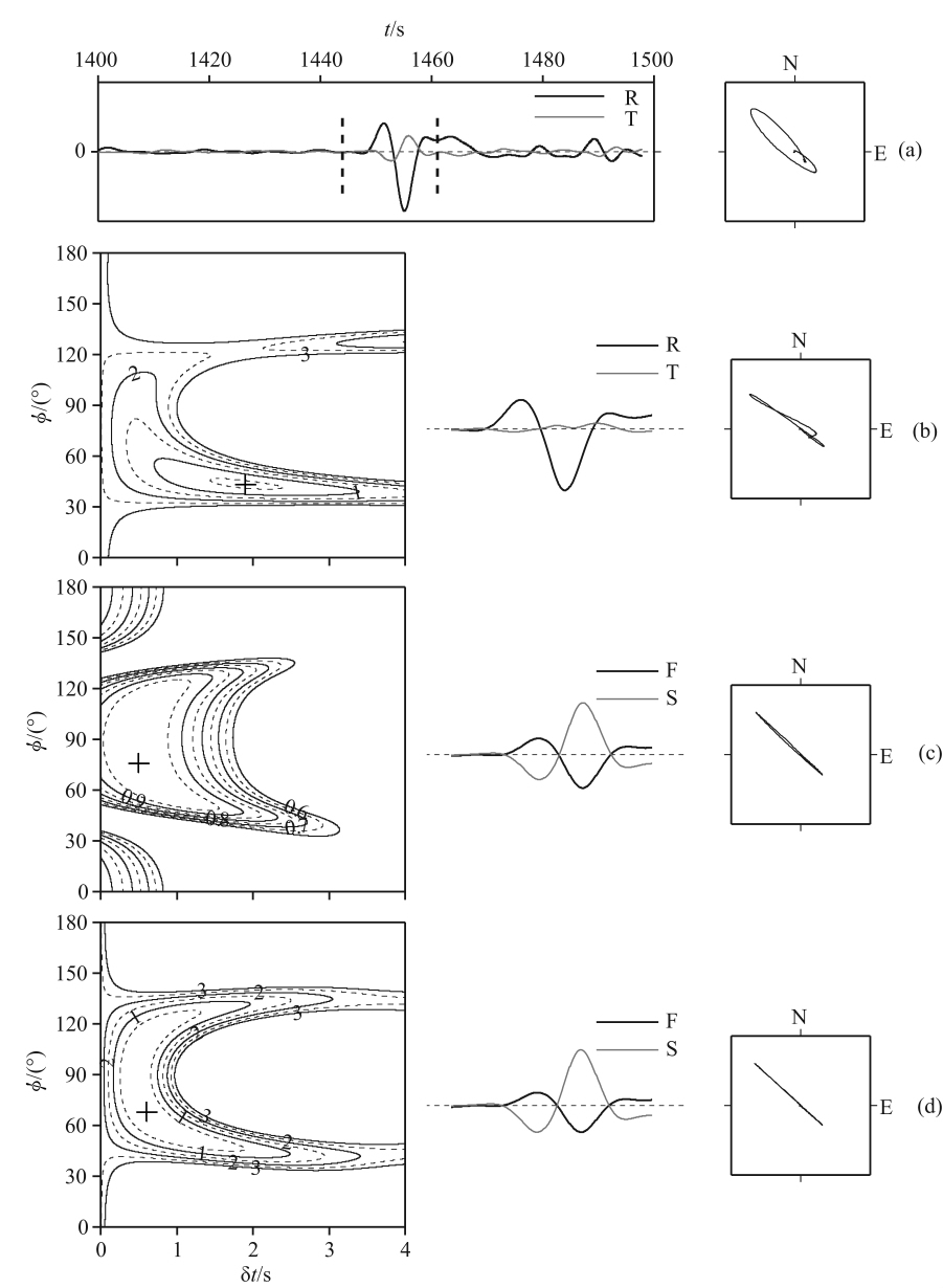 对于PmS 波分裂测量,首先采用时间域Wiener滤波方法计算径向和切向接收函数[30],然后使用全局法扫描PmS分裂参数,其中,极性偏差角的扫描范围仍设定为-30°~30°,快波方向扫描范围仍设定为0°~180°,而分裂时差扫描范围设定为0.0~0.40s, 步长为0.01s.