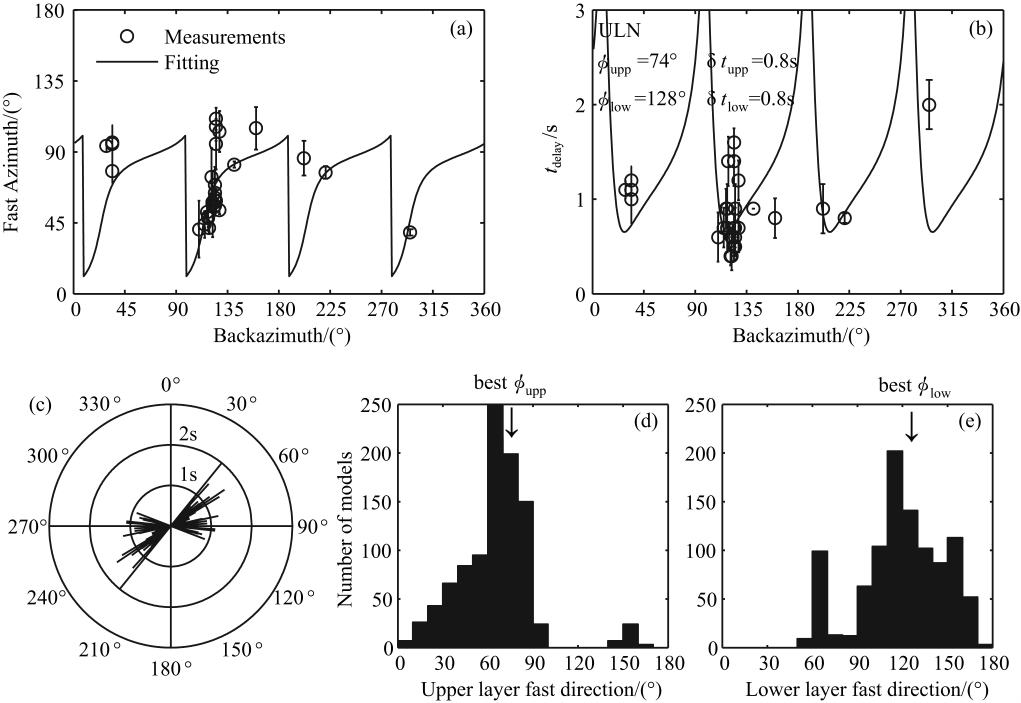单层各向异性假说是指各向异性位于一个有水平对称轴的单层内,并且各向异性参数(Φ,δt)随反方位角变化很小.我们在ULN 台站获得31个高质量的测量结果(表 1)以及21个“无分裂"事件.由图 5所示,ULN 台的快波方向变化范围是40°~130°,分裂时差变化范围是0.6~1.6s, 这么大的离散不能用单层各向异性来解释.Silver和Savage[31]的研究表明双层各向异性的各向异性参数随事件反方位角呈现出π/2周期性变化.由图 5a所示,在BAZ区间90°~150°,快波方向整体表现出递增趋势,按照BAZ增减90°的准则,其它区间也表现出这个趋势.为了检验ULN 台下方是否存在双层各向异性结构,我们使用31个高质量测量结果,运用Silver和Savage[31]的方法,模拟了具有水平对称轴的双层各向异性.选定信号主频为0.111Hz, 设置每层的快波方向扫描范围是0°~179°,步长为2°,分裂时差扫描范围是0~1.6s, 步长为0.20s, 1.6s为实际测量得到的最大分裂时差,我们计算了每一个双层模型的拟合曲线.通过计算,最合适的双层模型是Φupper=N74°E,δtupper=0.80s, Φlower=N128°E,δtlower=0.80s.图 5(a, b)显示了优选双层模型的拟合曲线,可见理论值曲线与实际测量拟合的较好,各向异性参数随反方位角呈现出π/2的周期性变化.预测得到的无效入射方位是4°,94°,184°和274°,我们得到的“无分裂"事件恰接近于94°.为了进一步验证优选模型是否具有统计意义,分析了与实际测量拟合程度最好、误差最小的1000个双层模型的两层快波方向分布.由图 5(d, e)所示,多数模型集中分布于优选快波方向所在区间,这说明优选模型代表了模型参数的总体趋势.因此,ULN台站下方存在双层各向异性这一复杂结构.