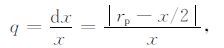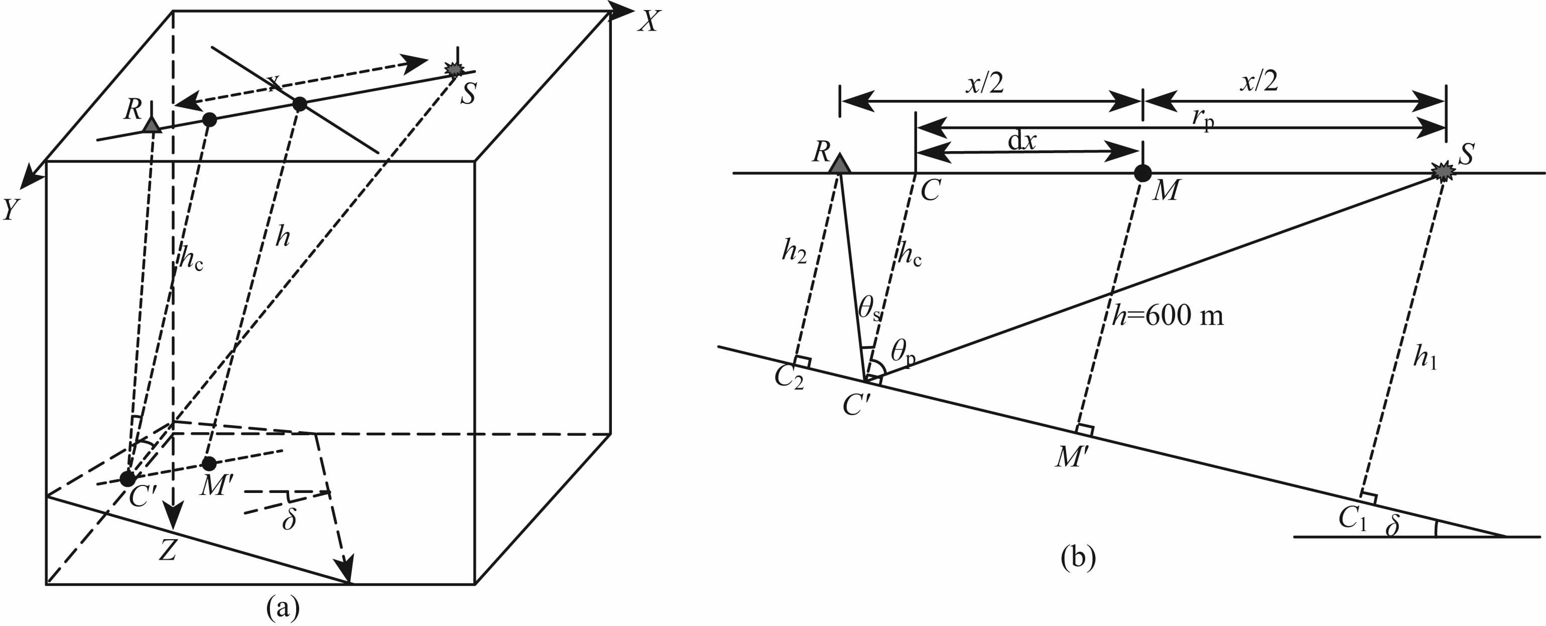 如图 1a所示,假设存在一个三维倾斜界面,界面倾角为δ.M为三维CMP 点,它到此界面的垂直距离为h,在界面上的投影点为M′.地表上以M点为中心点的炮点检波点对包含很多个方位,其中一条测线SR,S为炮点位置,R为检波点位置,SR长为x.此炮点检波点对在倾斜界面上的真正转换点为C′,CC′垂直于此界面与地表面相交于点C,长为hc.对路径面SRM′进行二维显示如图 1b.设SC长为rp,rp 与x/2之差的绝对值为dx,P 波入射角为θp,S波出射角为θs,界面视倾角为δ.为了便于分析,选取q来代表点M的离散度: