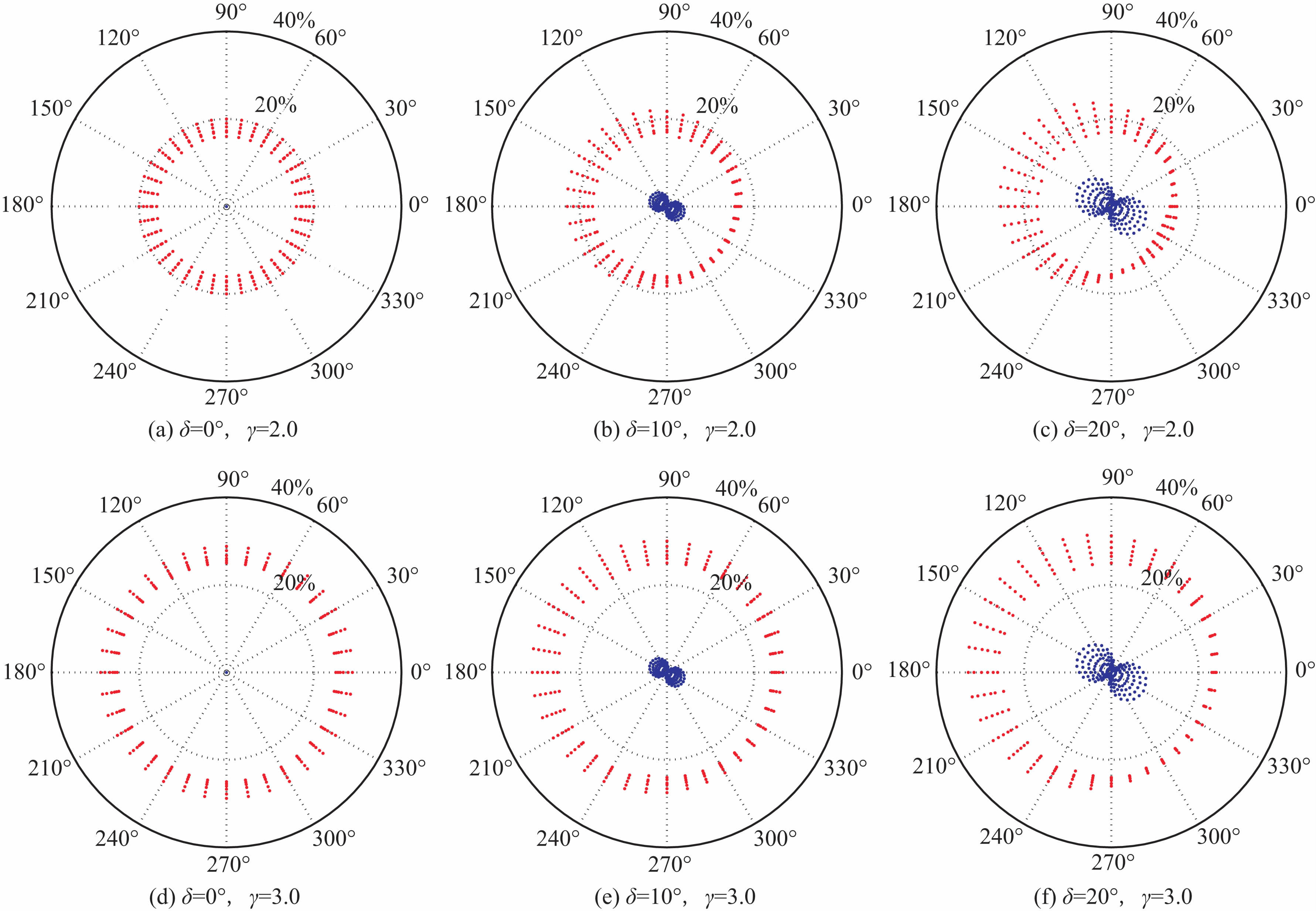 原点为CMP点;红色点为转换点C的离散程度q,蓝色点为P波反射点的离散度,道集分布在圆周上的36个方位,每个方位有6个记录道;PS波的dx最大分别为:(1)dxmax=120 m;(2)dxmax=139 m;(3)dxmax=157m;(4)dxmax=173m;(5)dxmax=187m;(6)dxmax=200 m;P 波的dx最大分别为:dxmax=0m、26m、51m.