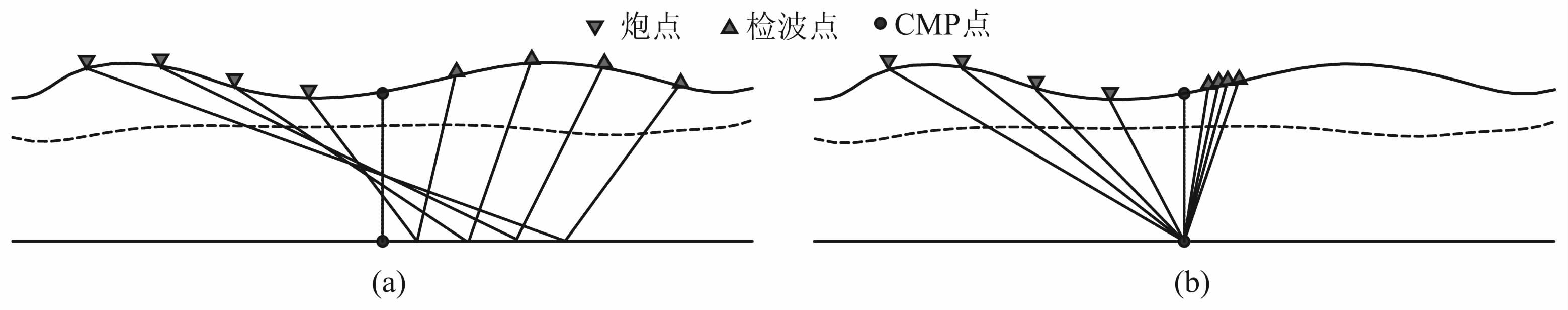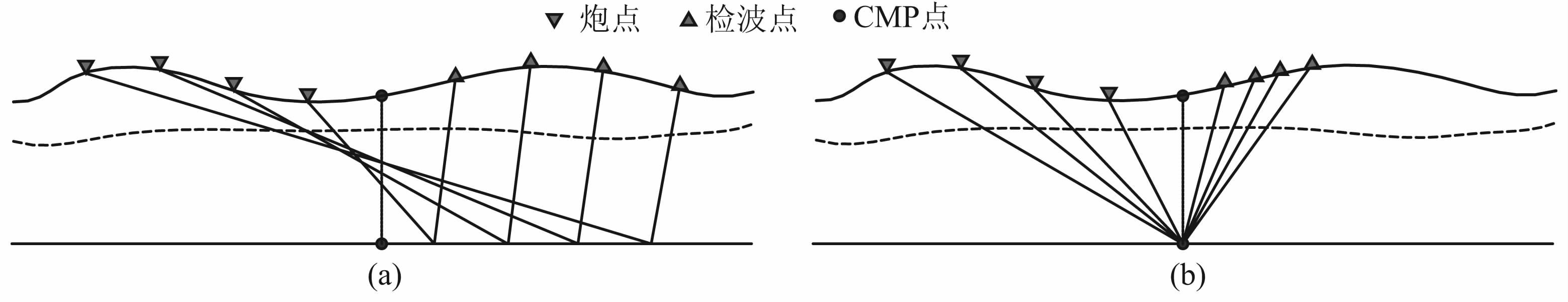 图 3 二维水平界面PS波CMP(a)和CCP(b)传播路径示意图(纵横波速比较小) Fig. 3 The schematic of the spreading path for PS wave using CMP (a) and CCP (b) methods on |